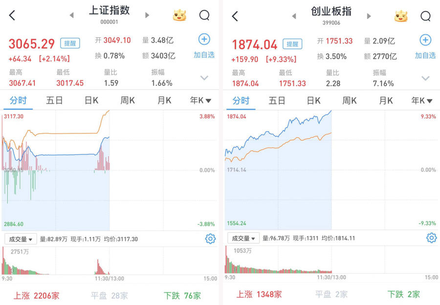 至午间收盘,上证综指涨2.14%,报3065.29点;科创50指数涨6.09%,报735.33点;深证成指涨6.37%,报9484.81点;创业板指涨9.33%,报1874.04点,创历史盘中最大涨幅。