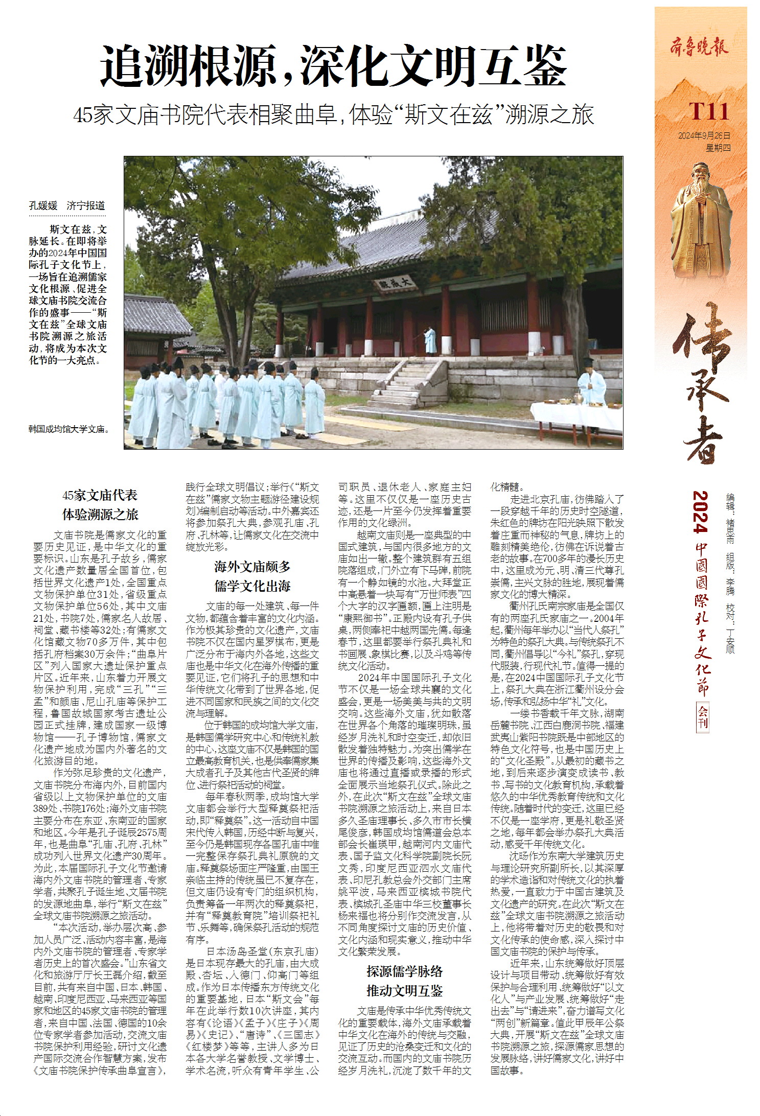 近年来,山东统筹做好顶层设计与项目带动、统筹做好有效保护与合理利用、统筹做好“以文化人”与产业发展、统筹做好“走出去”与“请进来”,奋力谱写文化“两创”新篇章。值此甲辰年公祭大典,开展“斯文在兹”全球文庙书院溯源之旅,探源儒家思想的发展脉络,讲好儒家文化,讲好中国故事。