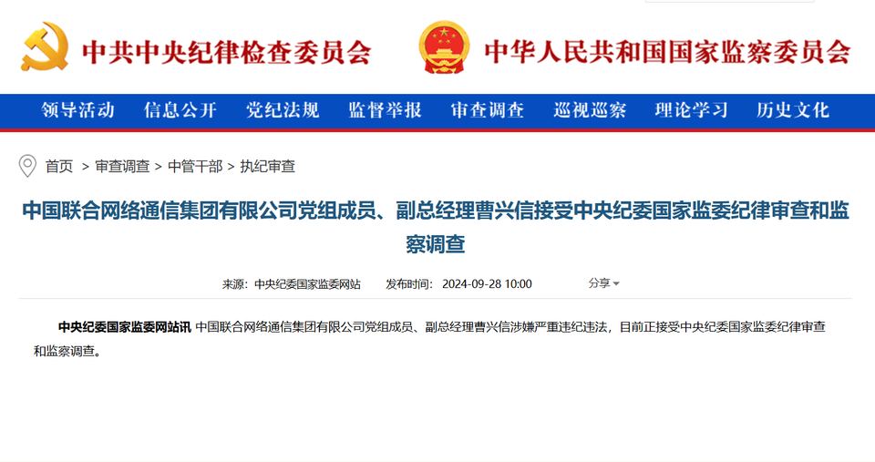 据中央纪委国家监委网站9月28日消息,中国联合网络通信集团有限公司党组成员、副总经理曹兴信接受中央纪委国家监委纪律审查和监察调查。