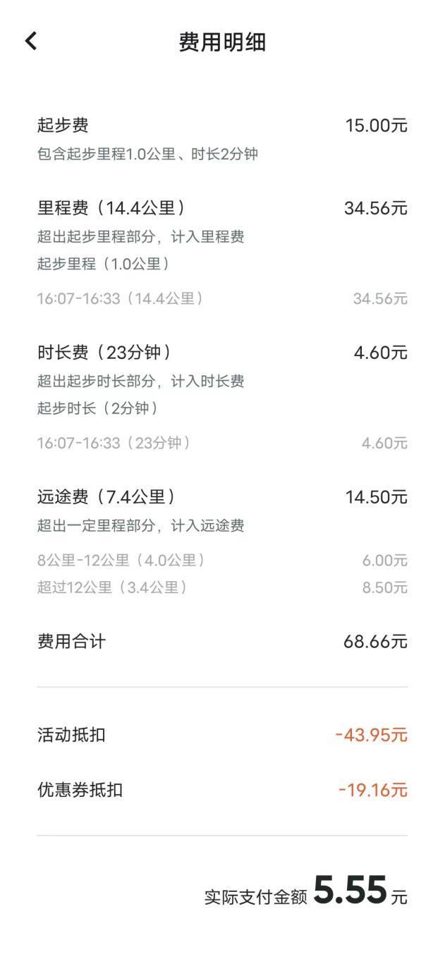 9月13日,青春观察员首先来到了洪山区,从武汉市武昌医院(南湖院区)附近乘车点出发,前往洪山江滩停车场。从预约到上车用时10分钟,全程大约14公里,用时23分钟到达目的地。由于是新人用户,萝卜优惠力度大,此次路程仅收费5.55元,价格相较于其他网约车更便宜。