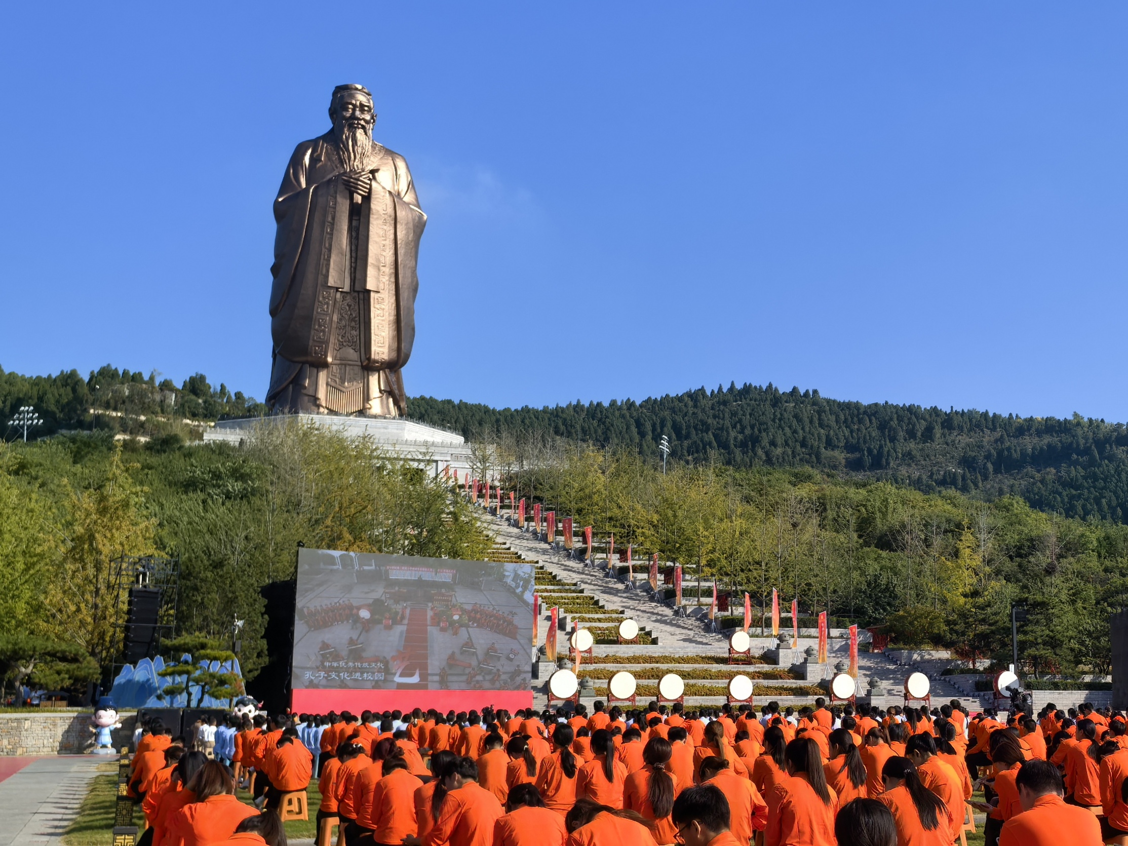 走进尼山圣境金声玉振广场,2575名学生面向孔子雕像,在老师带领下“正衣冠”,行“敬师礼”。全场合唱敬师礼主题歌《尼山敬师歌》,钟磬齐鸣,仪式感满满。