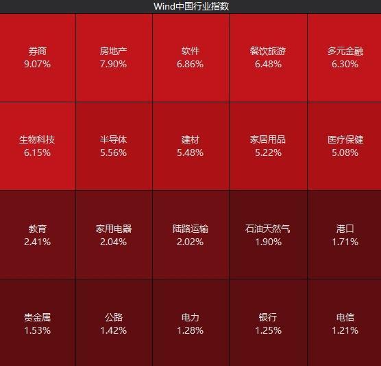 盘面上,券商股掀涨停潮,房地产板块集体狂飙,能源金属、软件开发等多板块大涨。