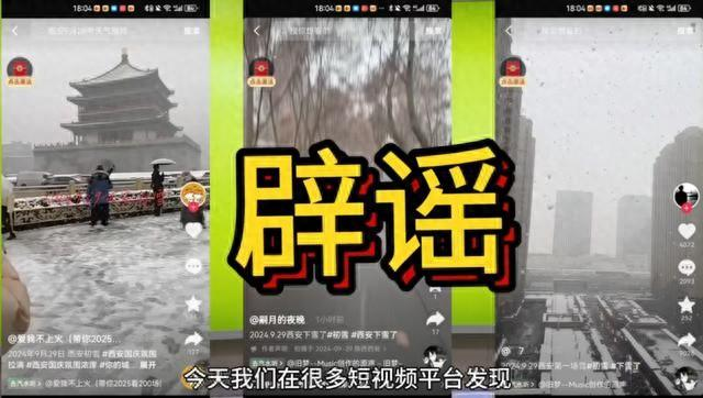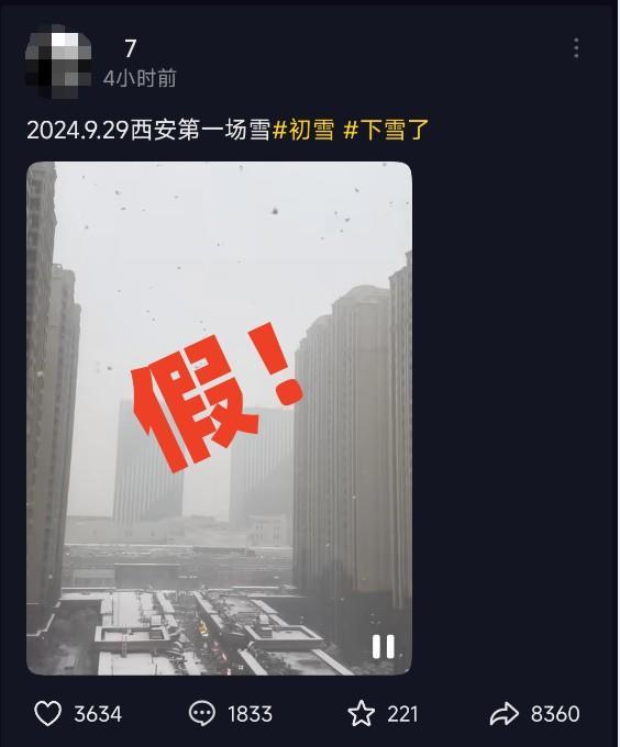 9月29日,据@西安气象:今天部分社交媒体出现西安今日(2024年9月29日)降雪为不实消息。