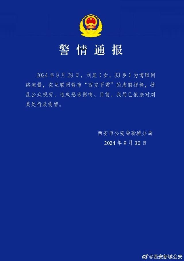 9月29日,刘某(女,33岁)为博取网络流量,在互联网散布“西安下雪”的虚假视频,扰乱公众视听,造成恶劣影响。目前,我局已依法对刘某处行政拘留。