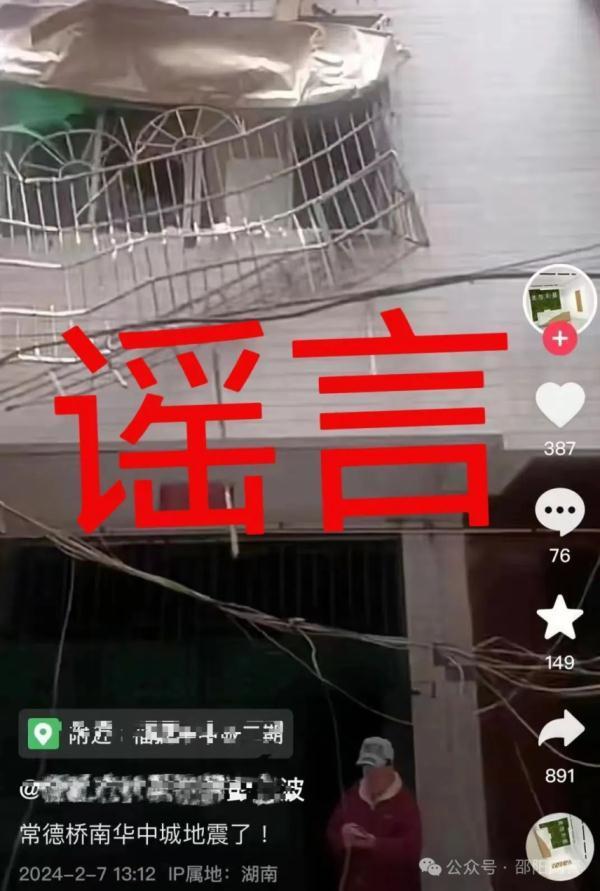 2024年2月,常德公安机关工作中发现,网民彭某某在短视频平台发布视频称“常德桥南华中城地震了!”