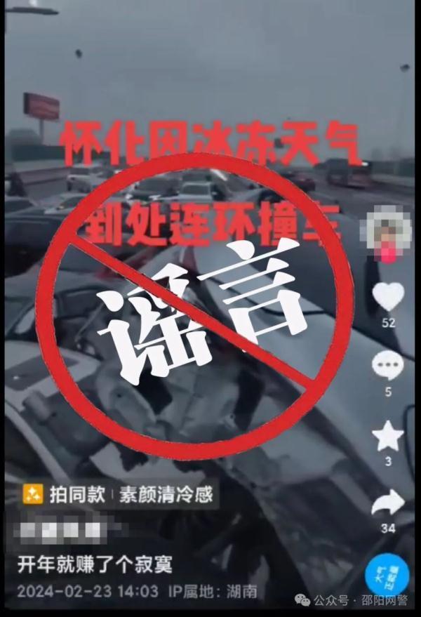 2024年2月,怀化公安机关工作中发现,网民刘某某利用低温冻雨天气的热度,为博人眼球、吸引流量,从网上下载多地撞车车祸现场视频进行剪辑,在短视频平台上发布虚假短视频,并配文“怀化因冰冻天气到处连环撞车”,引发网民关注,造成不良社会影响。公安机关已依法对刘某某作出行政处罚。
