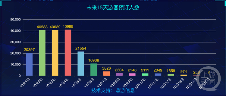 9月29日中午,九寨沟风景名胜区管理局发布公告称,截至9月29日11:00,九寨沟景区10月2日、10月3日门票预订4.1万张,已达到最大承载量。九寨沟风景名胜区管理局表示,九寨沟景区最大游客承载量为41000人次/天,售罄即止。九寨沟风景名胜区管理局官网的数据显示,截至9月30日1:20,九寨沟10月2日、3日和4日的游客预订人数都已超40000人次,其中10月4日预订已达41000人次。此外10月1日和10月5日的游客预订人数已超20000人次。