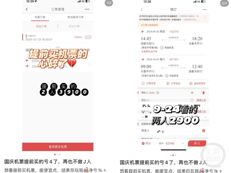 据报道,不少旅客发帖反馈,提前一两个月下单国庆节机票,结果节前发现价格出现大幅下滑。莫女士长居成都,国庆节计划前往新疆旅游,7月23日预订从绵阳机场飞乌鲁木齐的航班,双人往返共计3900元。“9月24号我又搜了一下,绵阳飞乌鲁木齐双人往返票价直降500元。”莫女士称,不仅如此,从成都飞乌鲁木齐,双人往返票价更低,只需要2940元。杨先生8月中旬下单9月30日三亚飞往重庆的机票,价格为1729元,10月6日返程1462元。但9月14号再次搜索发现,往返程票价均降至500-800元左右。“直接损失上千元,我只好自己花手续费退了重新下单。”他表示。