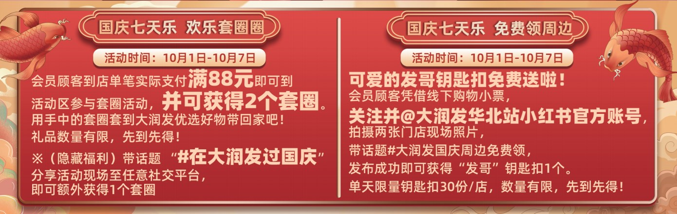 此外,会员顾客凭线下购物小票,关注并@大润发华北站小红书官方账号,拍摄2张门店现场照片带话题“#大润发国庆周边免费领”发布成功,即可获得“发哥”钥匙扣1个。数量有限,先到先得!