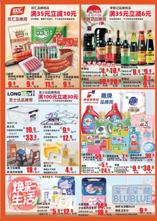 此外,还有品牌周活动,多个品牌推出多重优惠。美旅箱包(指定单品)5折;相宜本草/百雀羚女士护肤两件七折;袋装烧烤料满30元立减6元;圣农品牌系列商品满49元立减15元;维达超韧抽纸100抽*10包,19.9元/提;双汇品牌商品满35元立减10元;李锦记品牌商品满35元立减6元;龙士达品牌商品满100元立减30元;雕牌、超能多种洗衣液价格优惠;ABC卫生巾女性安睡裤5.9元/包……希望顾客真正感受到实惠满满。