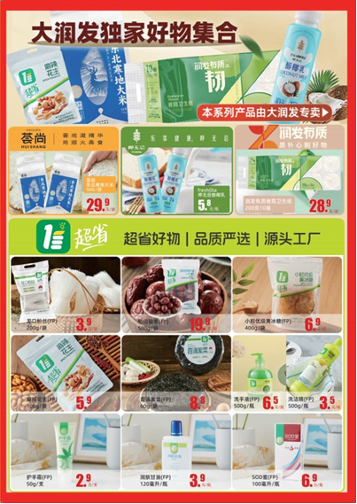 荟尚东北寒地大米5千克/袋,29.9元/袋;润发有质卷筒卫生纸200克10卷,28.9元/袋;龙口粉丝200克/袋,3.9元/袋;和田骏枣500克/袋,19.9元/袋;小粒优级黄冰糖400克/袋,6.9元/袋;麻辣花生100克/袋,5.9元/袋;霞浦紫菜60克/袋,8.8元/袋……十余种大润发独家好物,涵盖粮油副食、日用百货等多个品类,顾客能够以更优惠的价格购买到心仪商品。