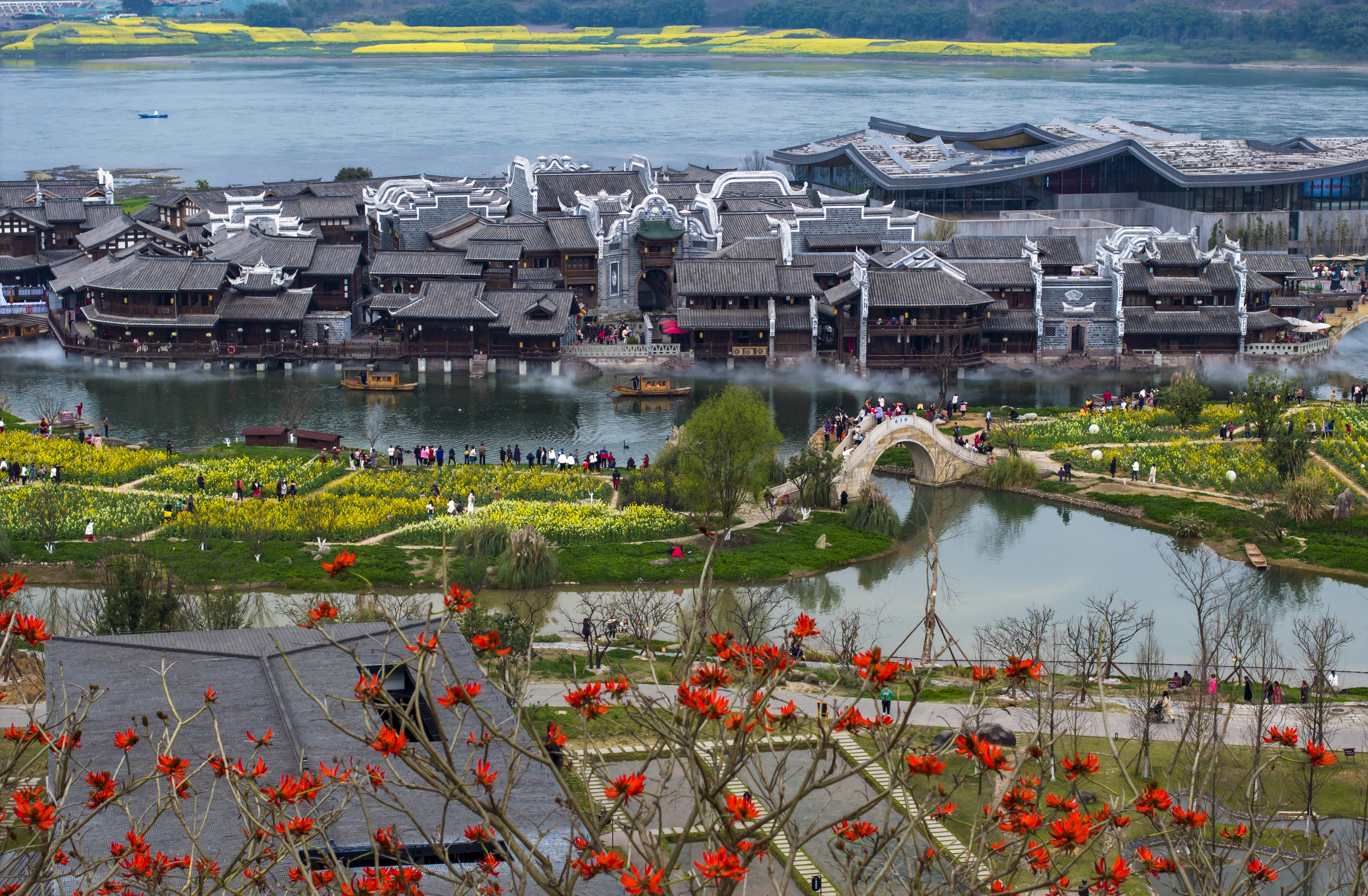 ↑2024年3月8日,四川省宜宾市翠屏区李庄镇月亮田春光如画,游人如织。(无人机照片)CICPHOTO/曾朗 摄