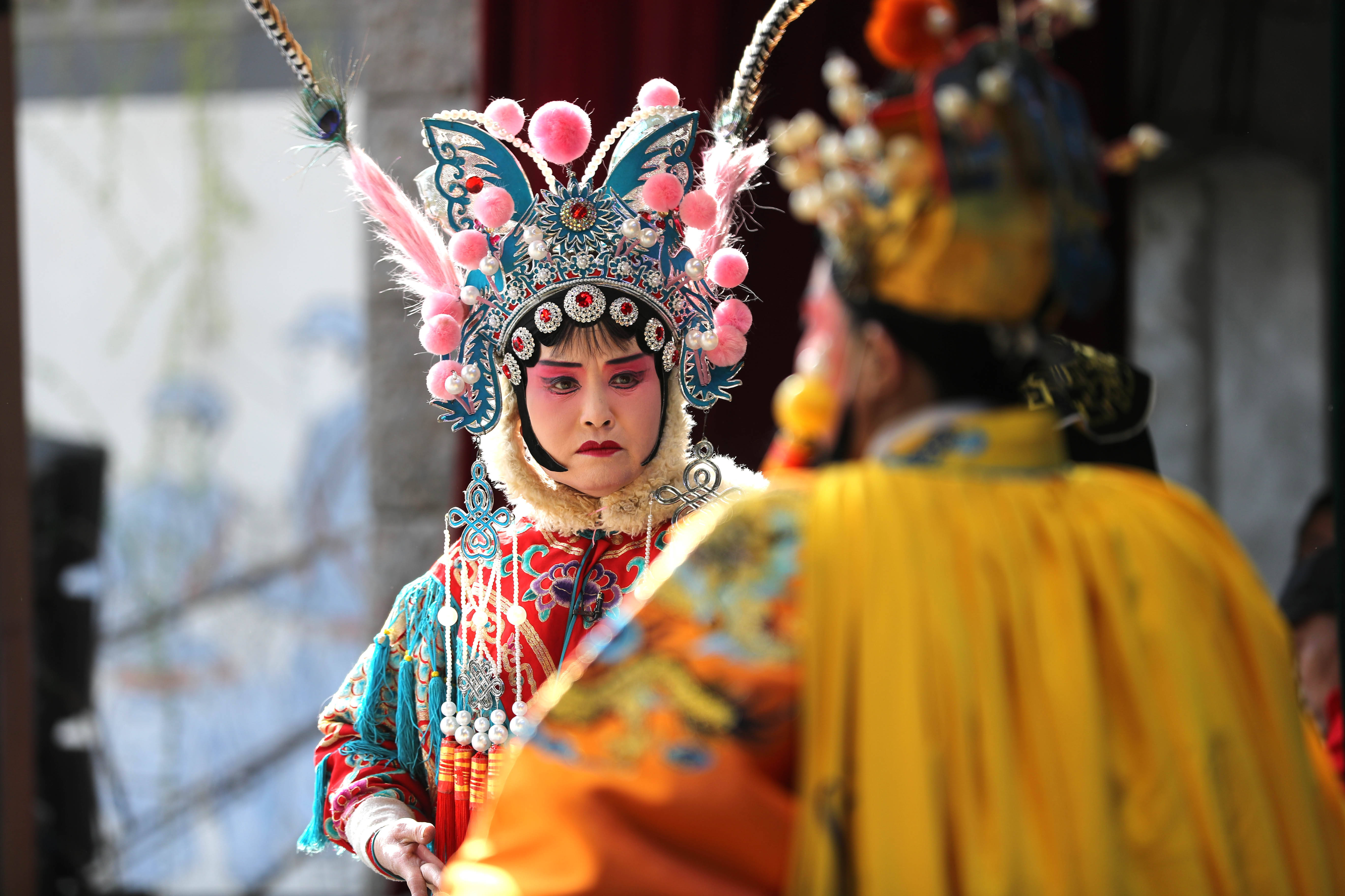 ↑2023年3月14日,晋剧演员在河北省石家庄市井陉县南障城镇蒋家村剧场舞台表演晋剧《杨继业归宋》。CICPHOTO/王保龙 摄