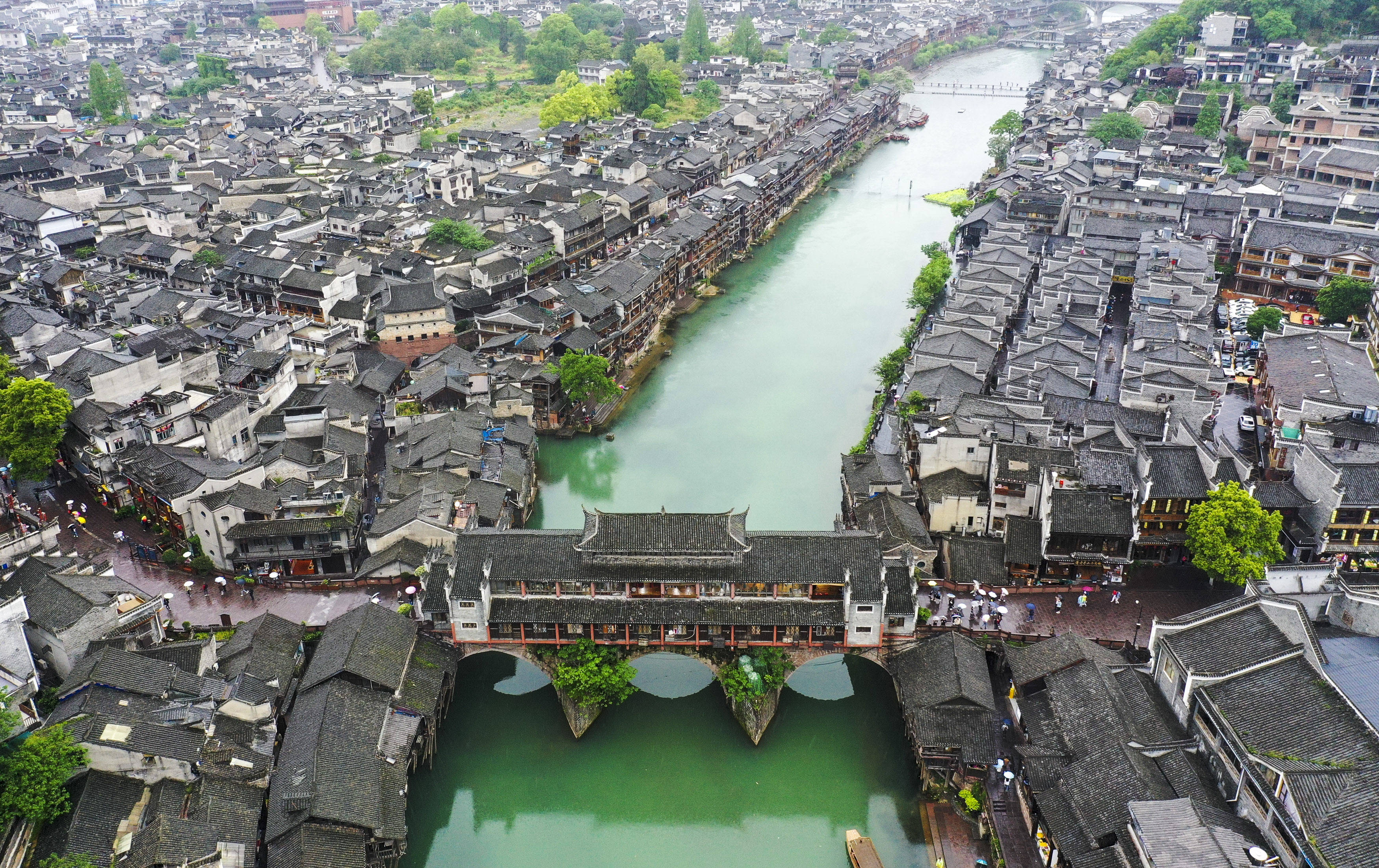 ↑2023年5月5日,游客在湖南省湘西土家族苗族自治州凤凰古城游玩。(无人机照片)CICPHOTO/周秀鱼春 摄