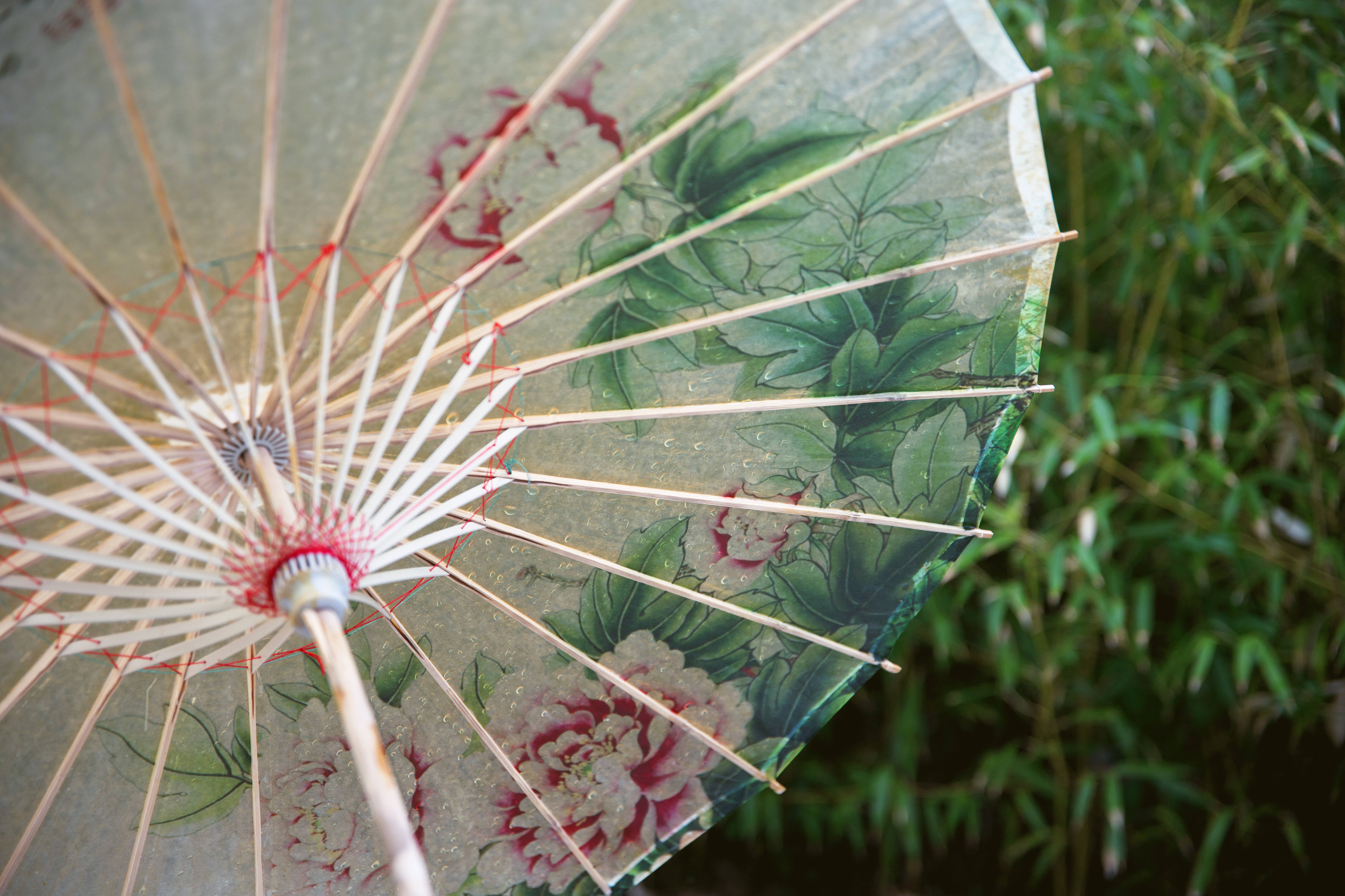 ↑2022年5月25日,在山东省青岛市象耳山公园,雨滴拍打着油纸伞。CICPHOTO/张鹰 摄