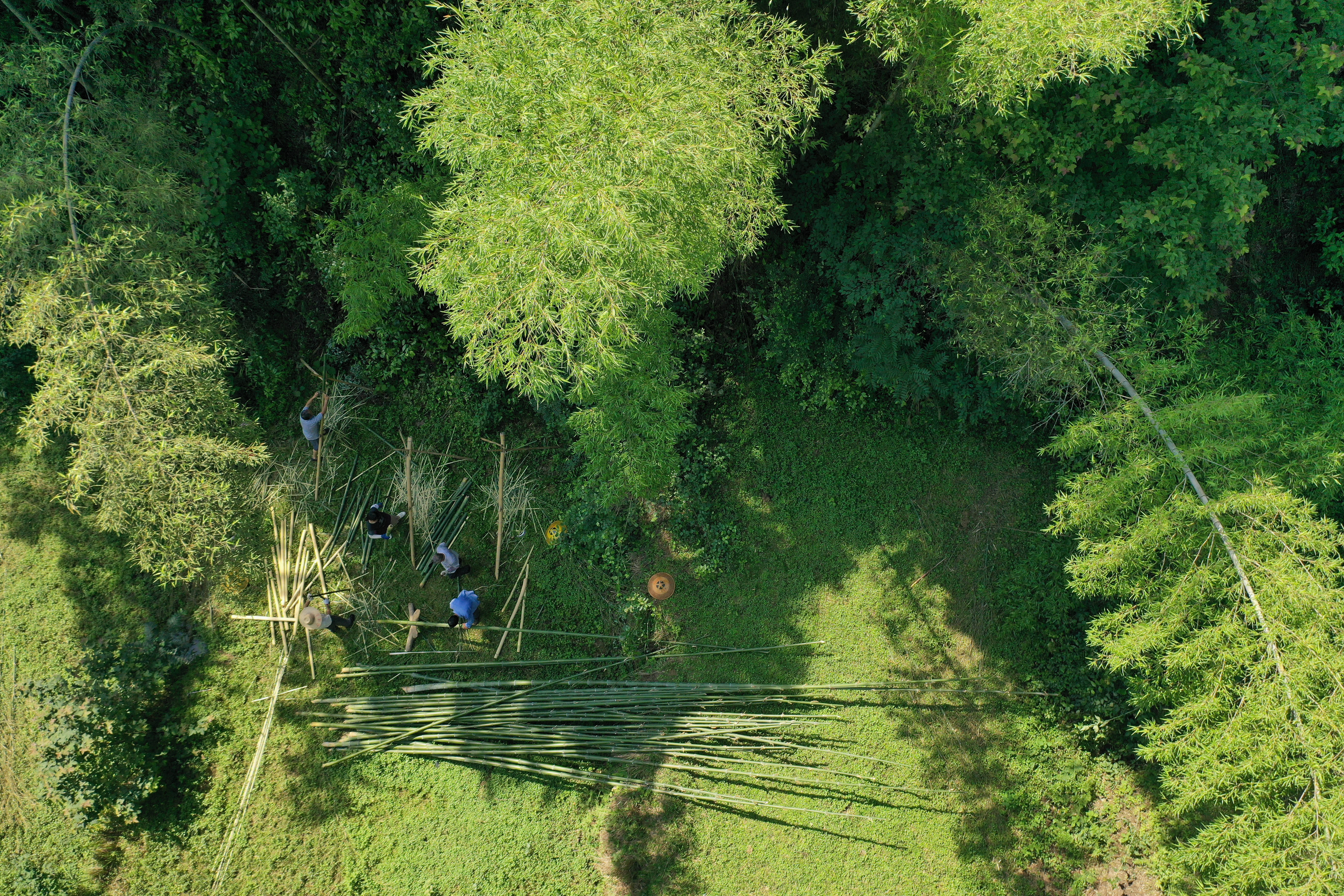 ↑2023年5月28日,湖南省邵阳市隆回县滩头镇祝家桃林村的村民在伐竹、刮青、劈料,为手工抄纸备料。(无人机照片)CICPHOTO/曾勇 摄