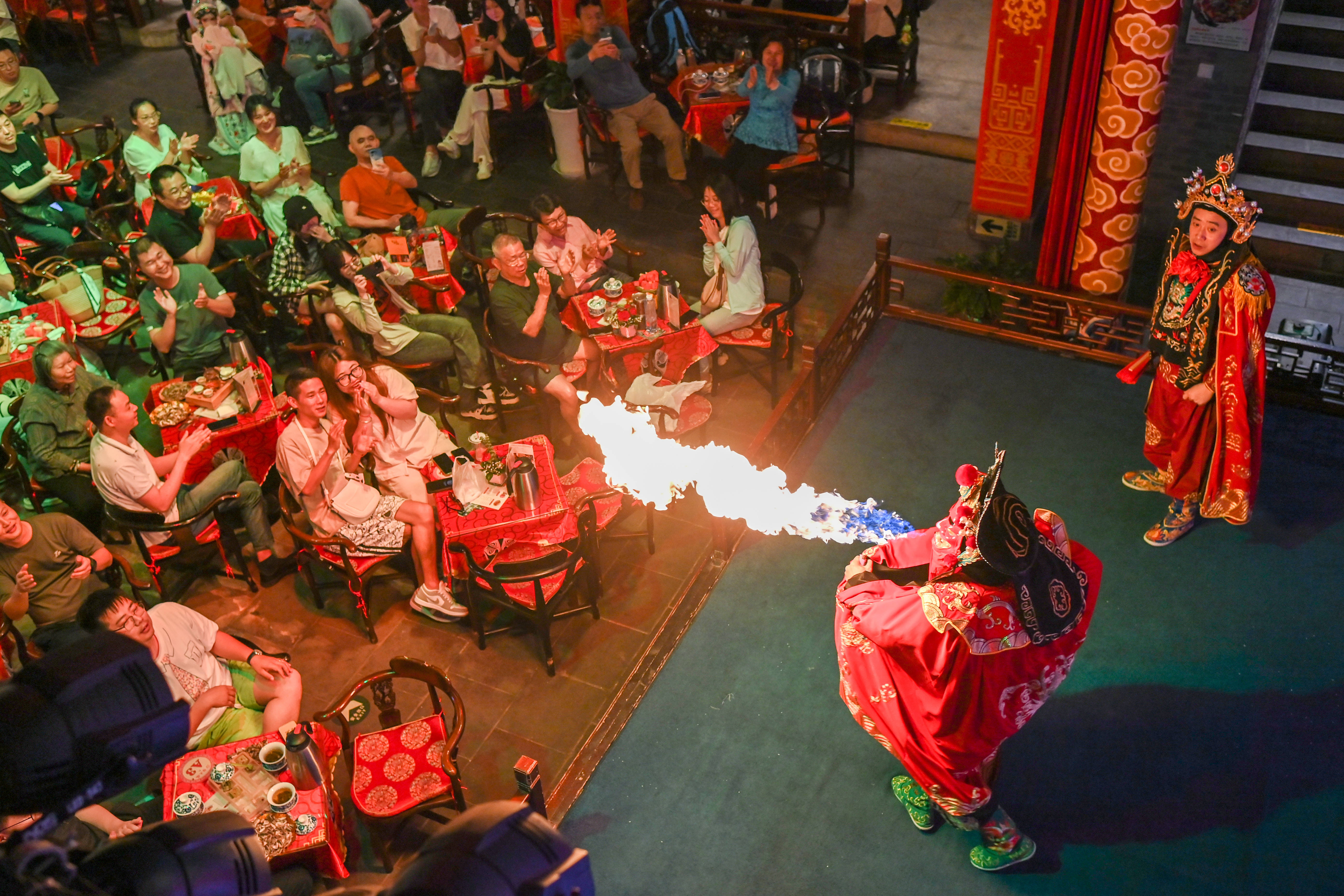 ↑2024年5月14日,在重庆市沙坪坝区磁器口古镇,川剧演员精彩的表演赢得游客阵阵掌声。CICPHOTO/孙凯芳 摄