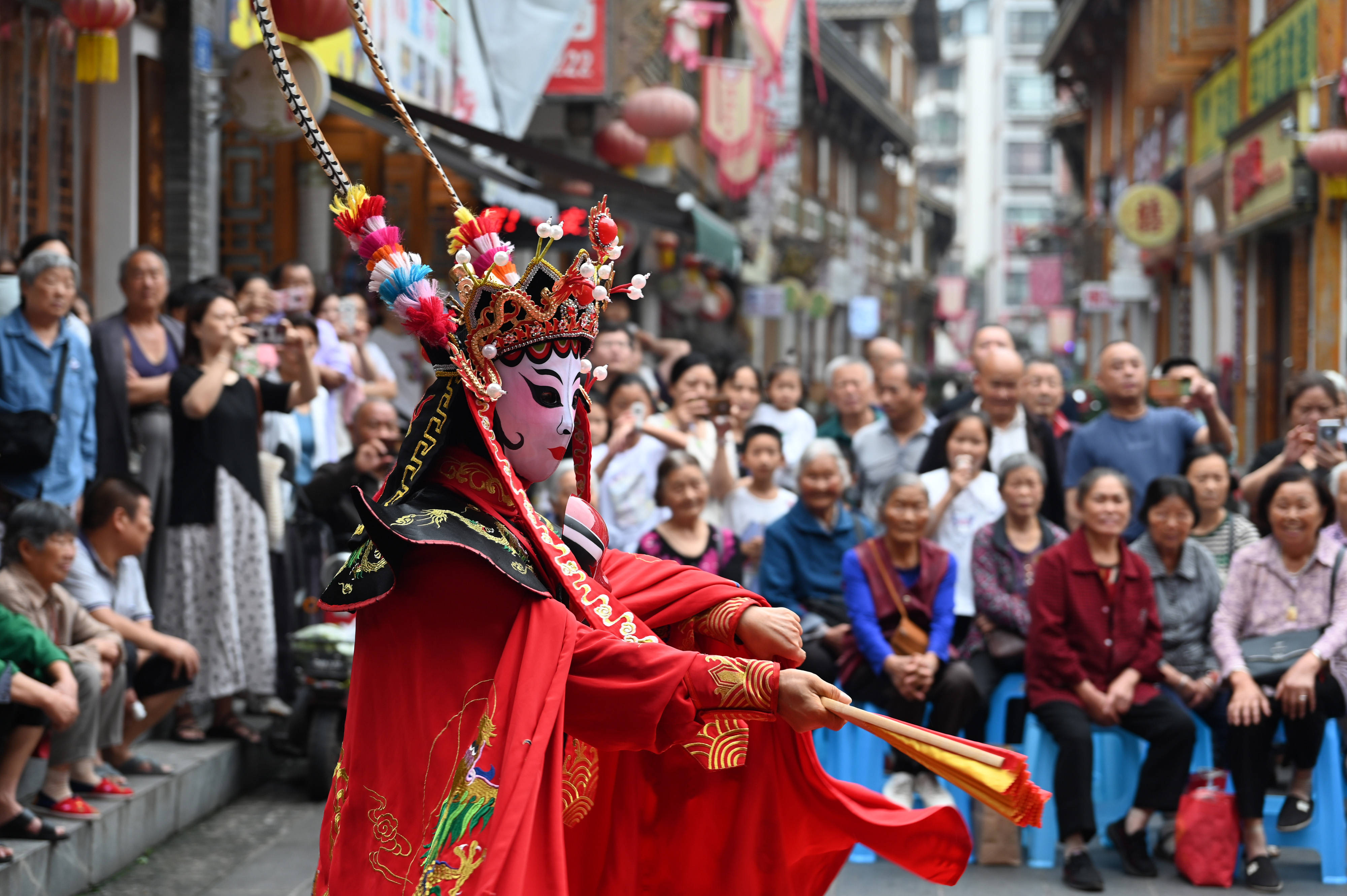 ↑2024年6月9日,在四川省内江市东兴区东兴老街,市民在欣赏川剧变脸。CICPHOTO/唐明润 摄