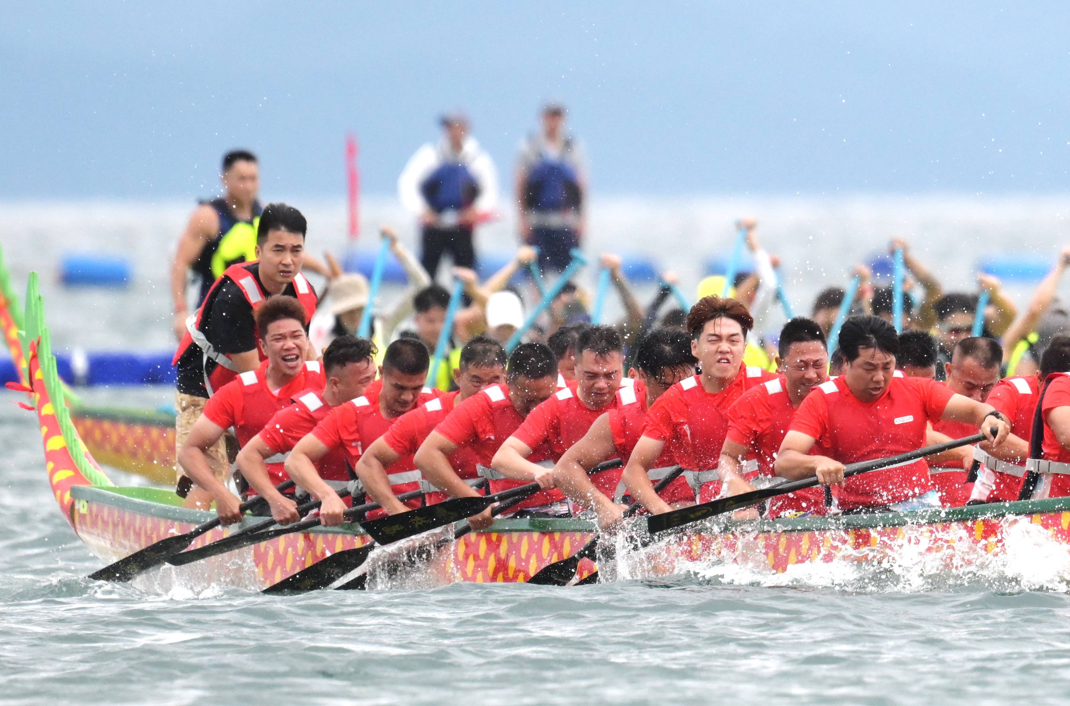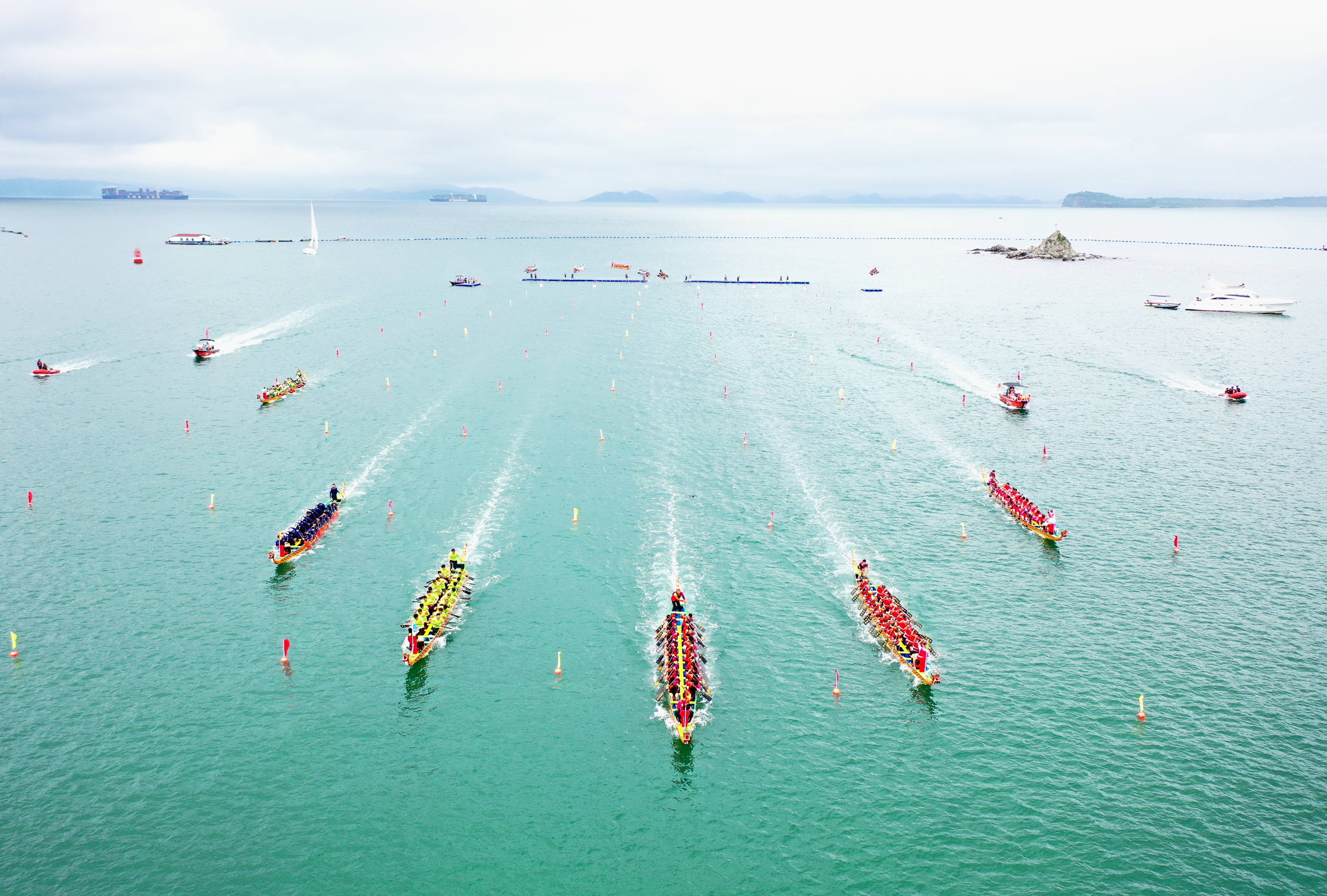 ↑2024年6月7日,在广东省深圳市大鹏新区南澳月亮湾,2024粤港澳大湾区(深圳南澳)海上龙舟赛盛大开幕。CICPHOTO/李坚强 摄