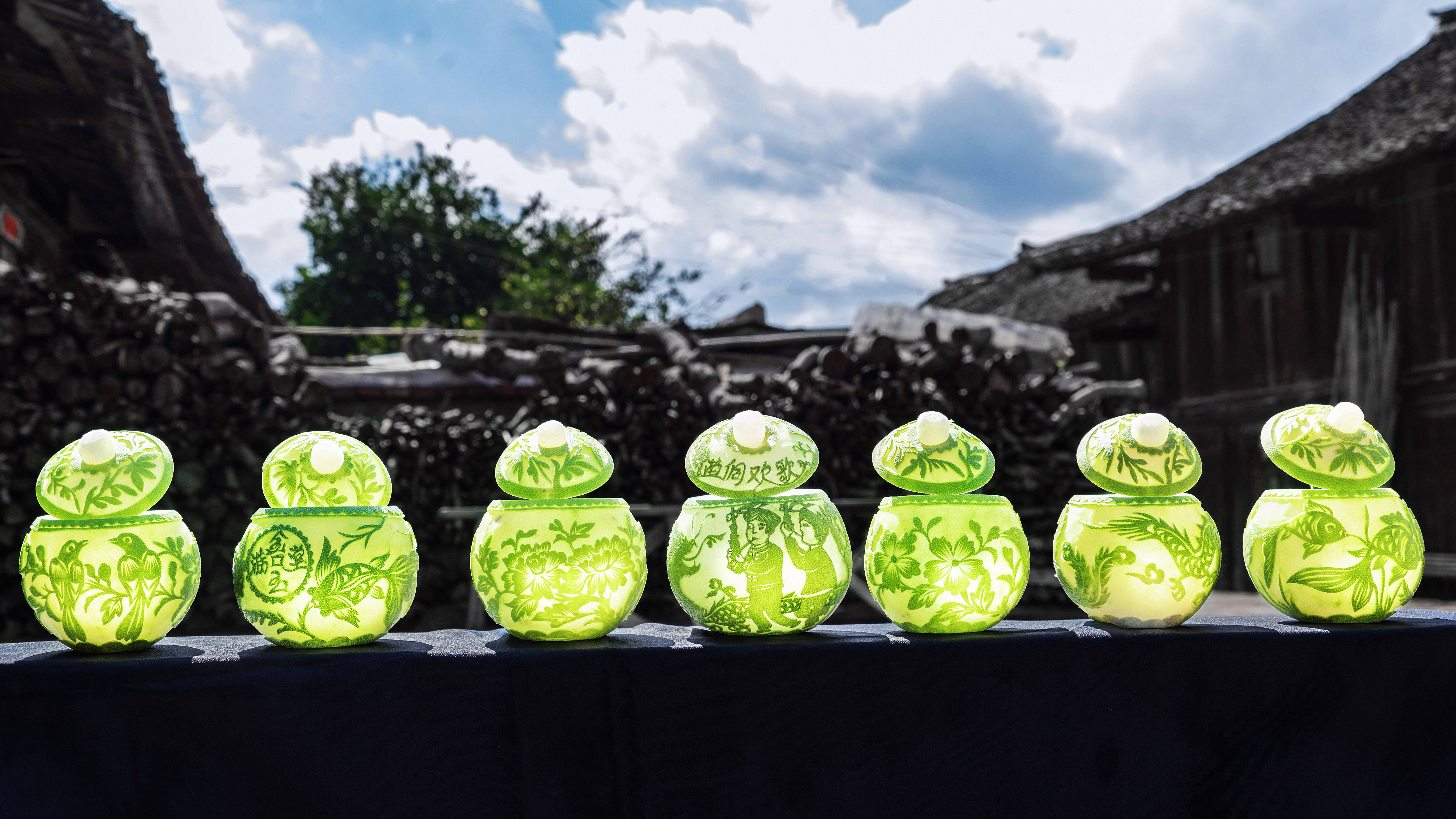 ↑2024年8月4日,在湖南省怀化市靖州苗族侗族自治县渠阳镇夏乡村,村民在太阳下晾晒罐形雕花蜜饯。CICPHOTO/田其珍 摄