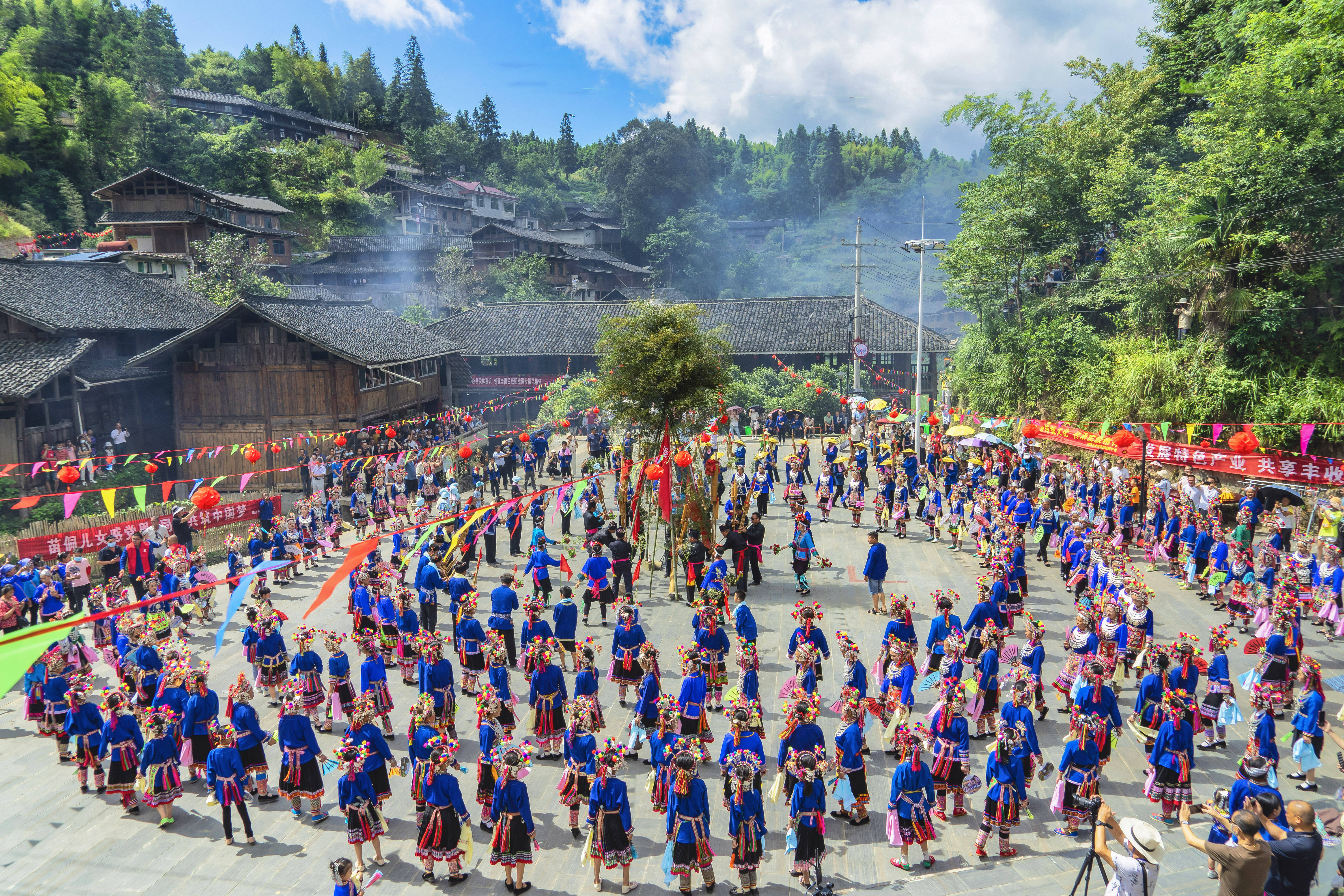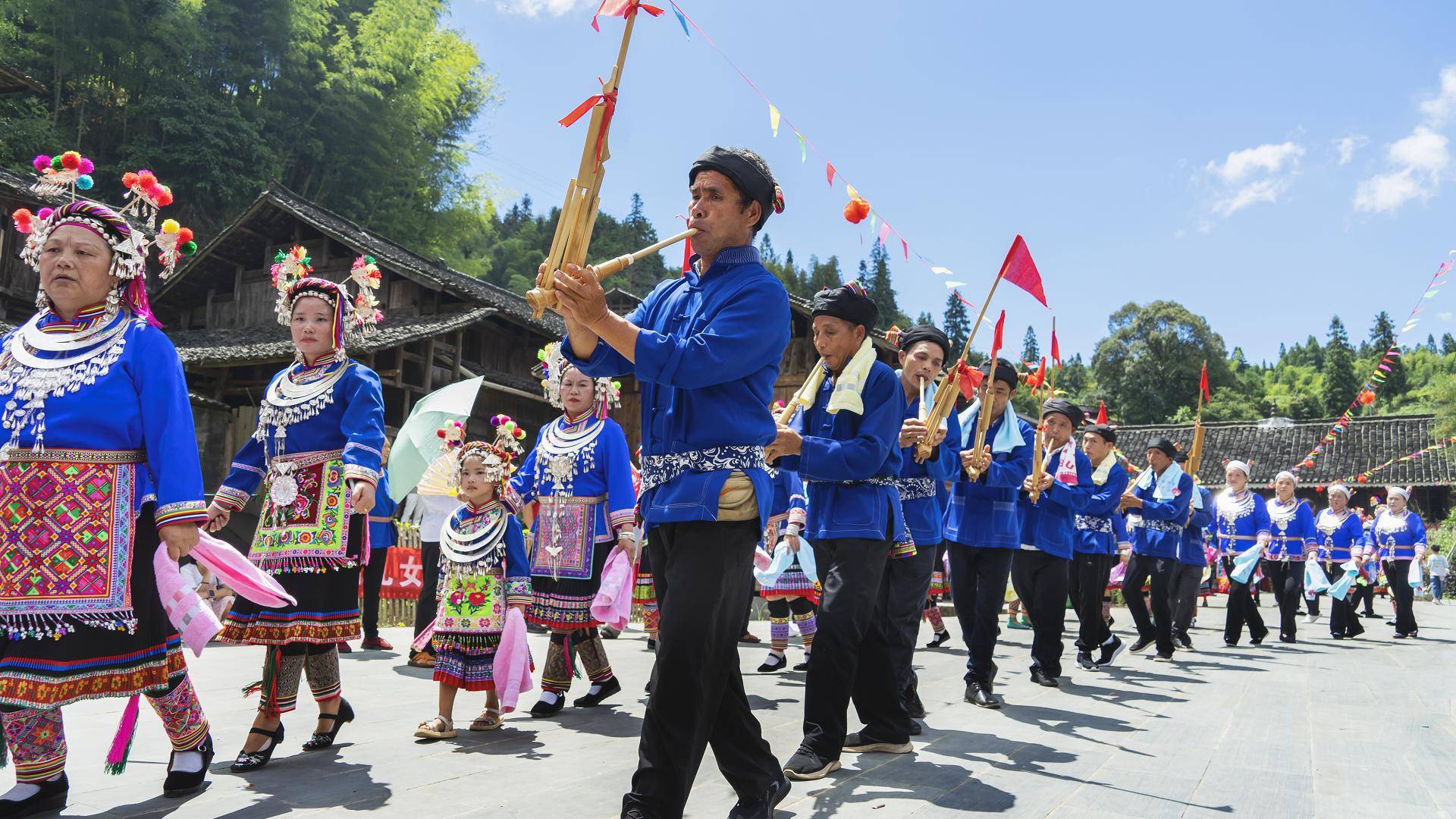↑2022年8月12日,湖南省怀化市靖州苗族侗族自治县藕团乡新寨村村民身着节日盛装,吹响芦笙,跳着欢快的踩堂舞。CICPHOTO/田其珍 摄