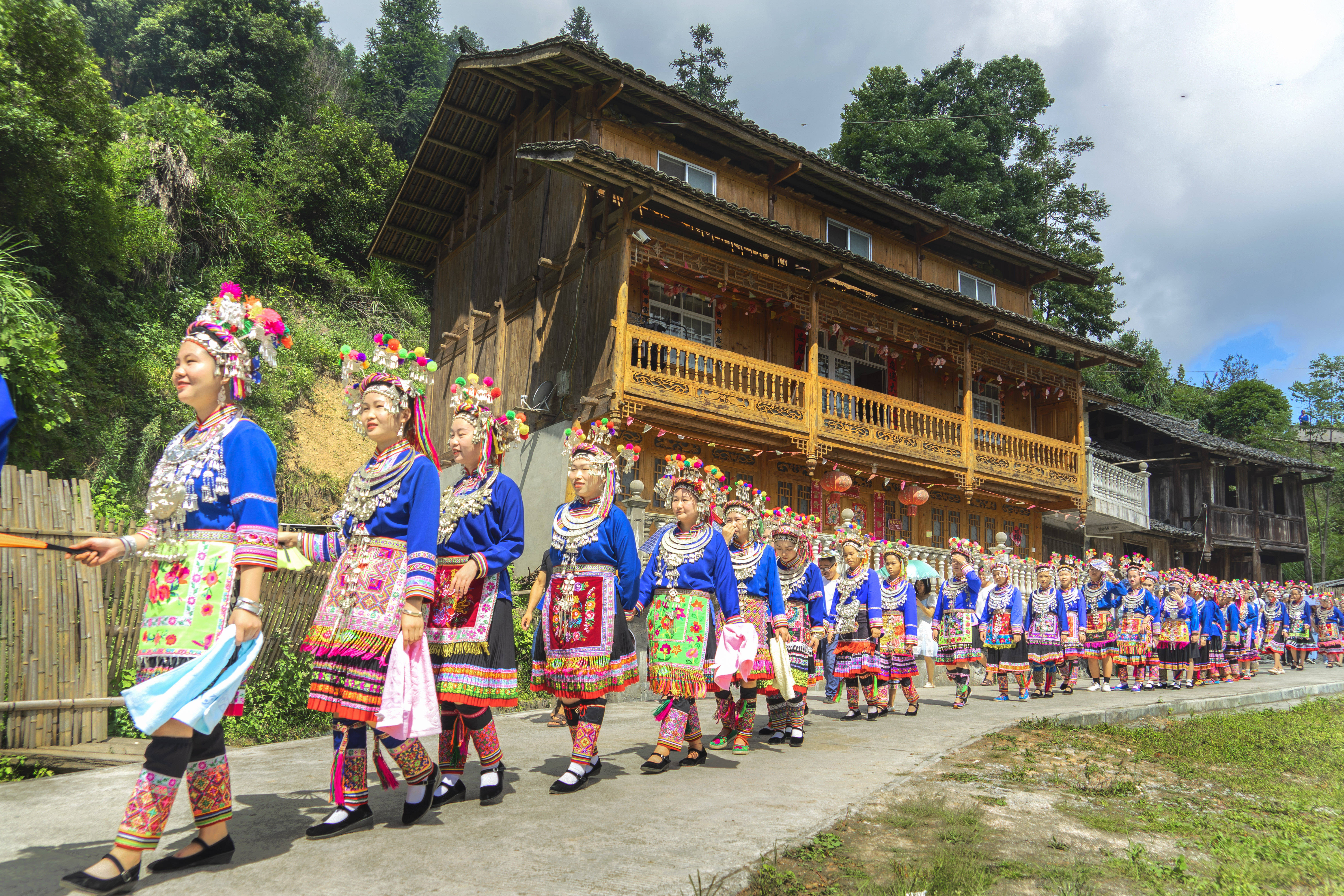 ↑2023年12月13日,贵州省黔东南苗族侗族自治州从江县斗里镇台里村,身着盛装的苗族姑娘在参加芦笙节活动。2006年,苗族芦笙舞被列入国家级非物质文化遗产名录。CICPHOTO/龙梦前 摄