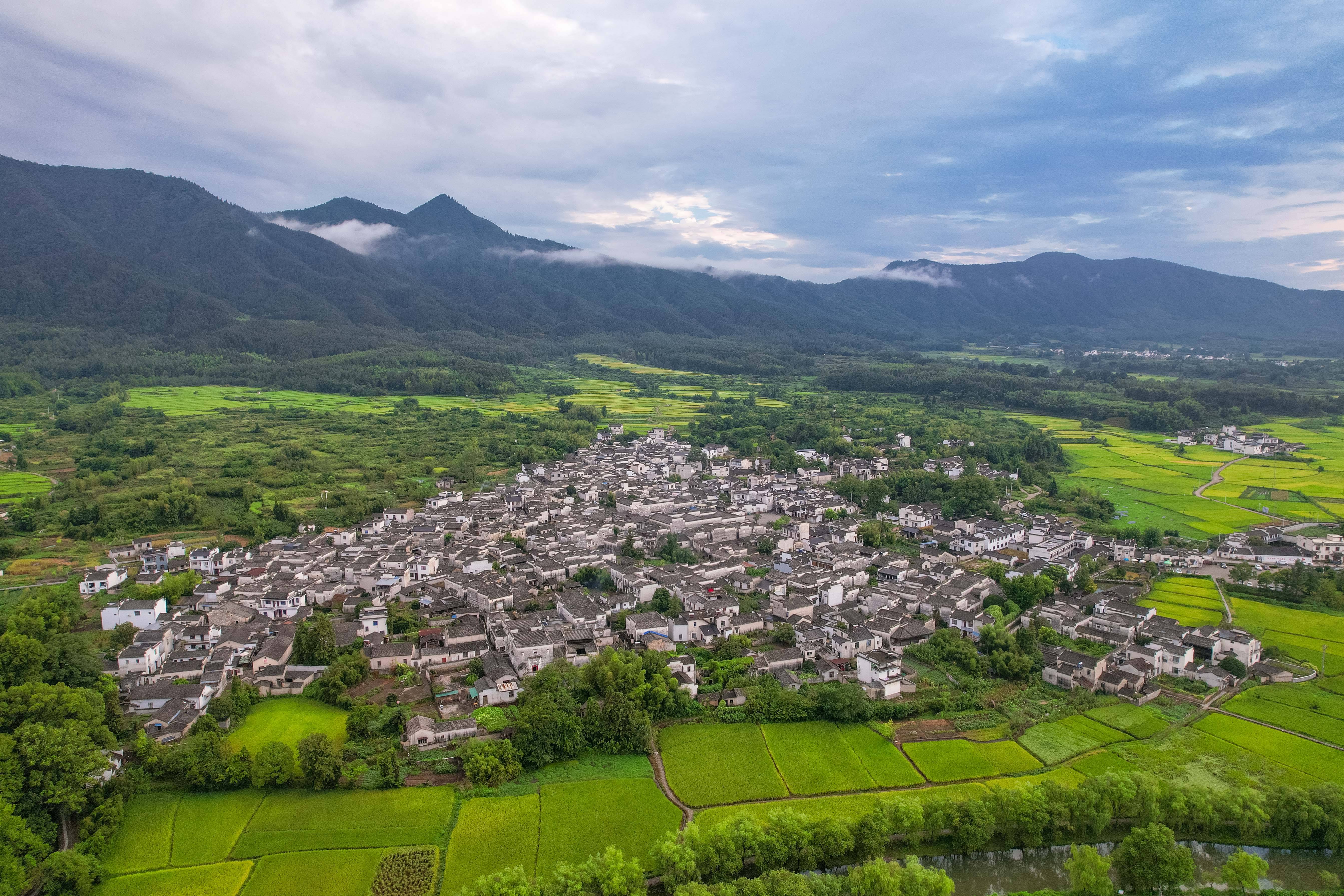 ↑2024年8月19日,安徽省黄山市黟县南屏村初秋美景如画。(无人机照片)CICPHOTO/张鹰 摄