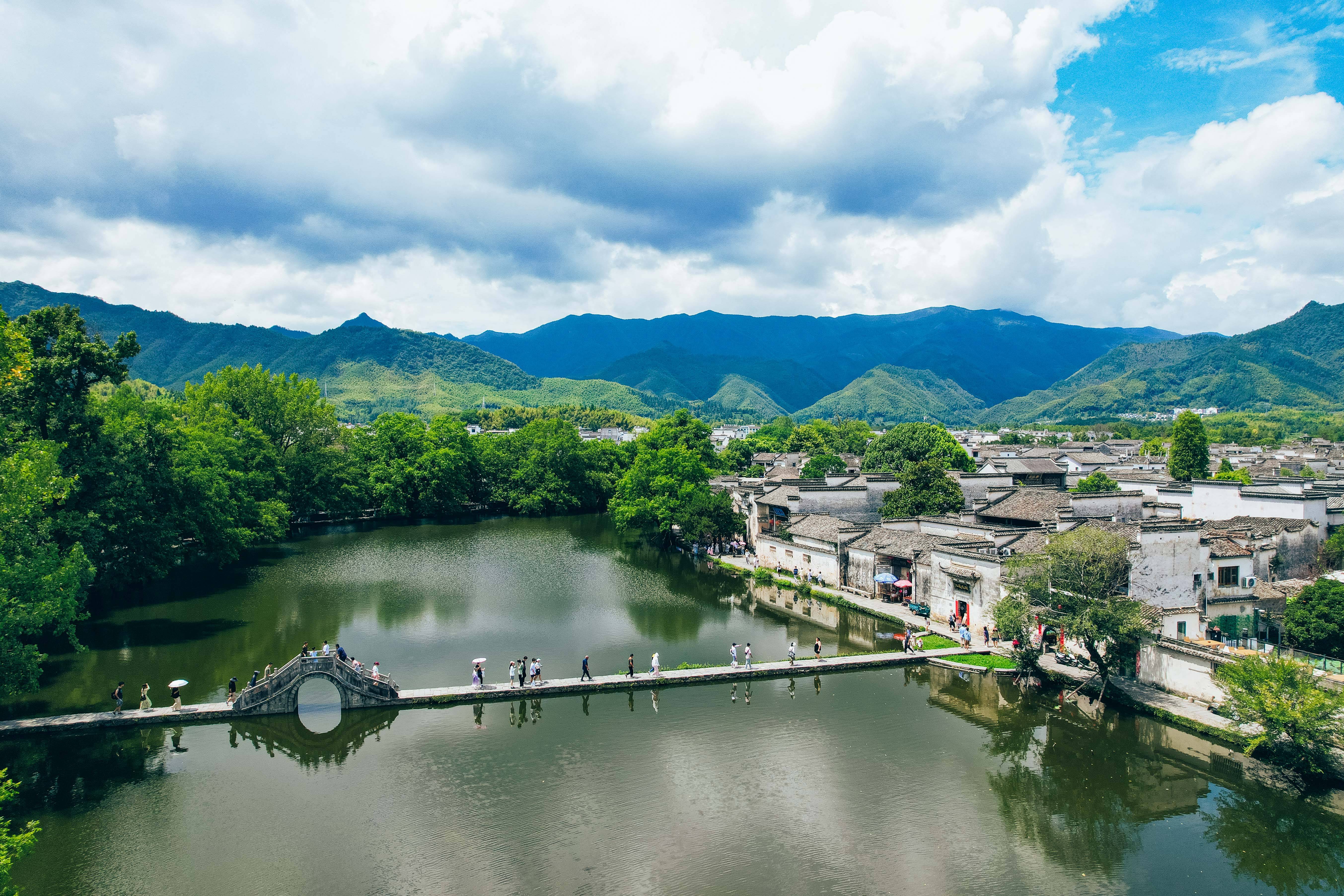 ↑2024年8月20日,游客在安徽省黄山市黟县宏村景区游览。(无人机照片)CICPHOTO/张鹰 摄