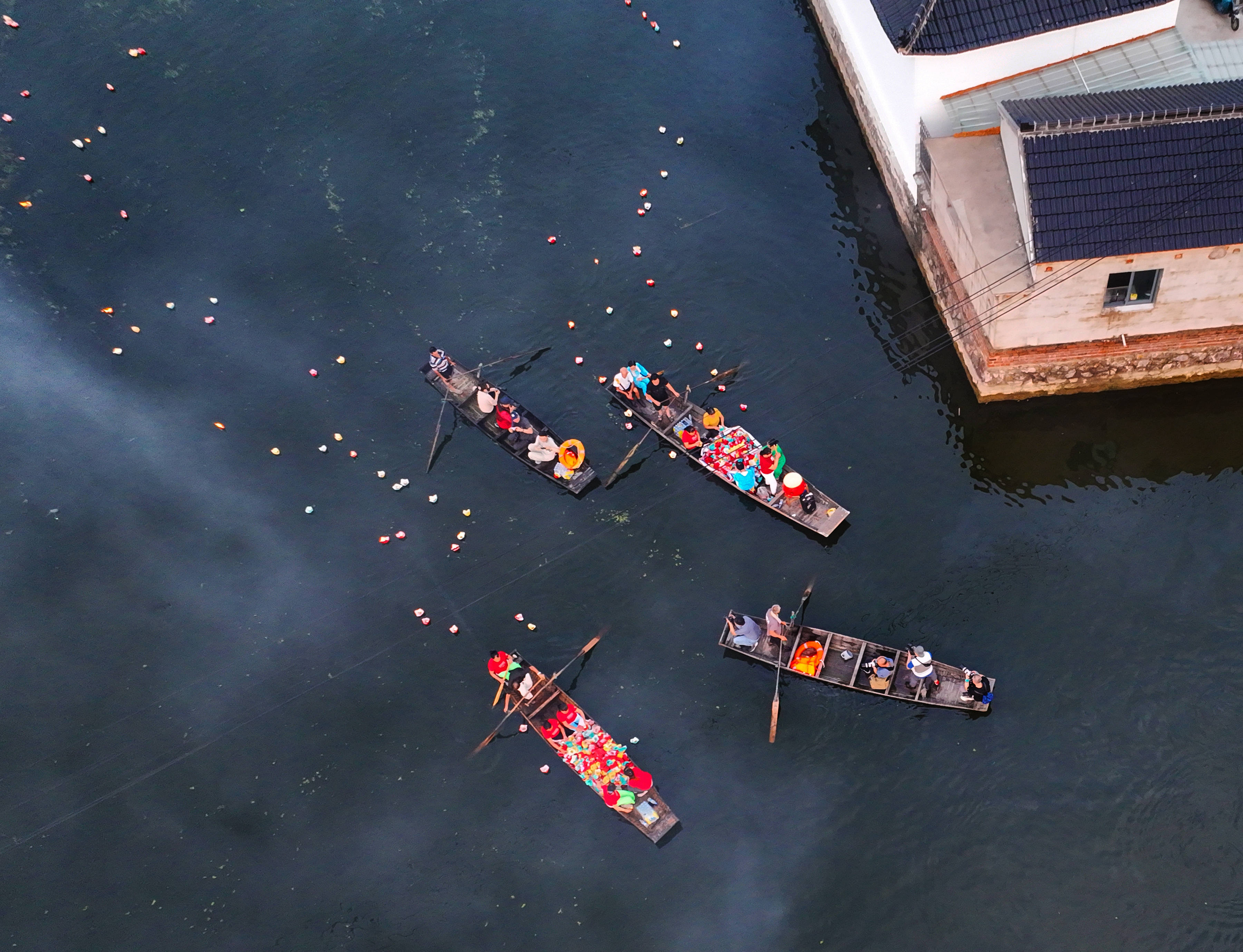 ↑2023年8月22日,在安徽省当涂县塘南镇曹坝村夏庄自然村,村民在“夏庄七夕水灯”节上漂放水灯。(无人机照片)CICPHOTO/王玉实 摄