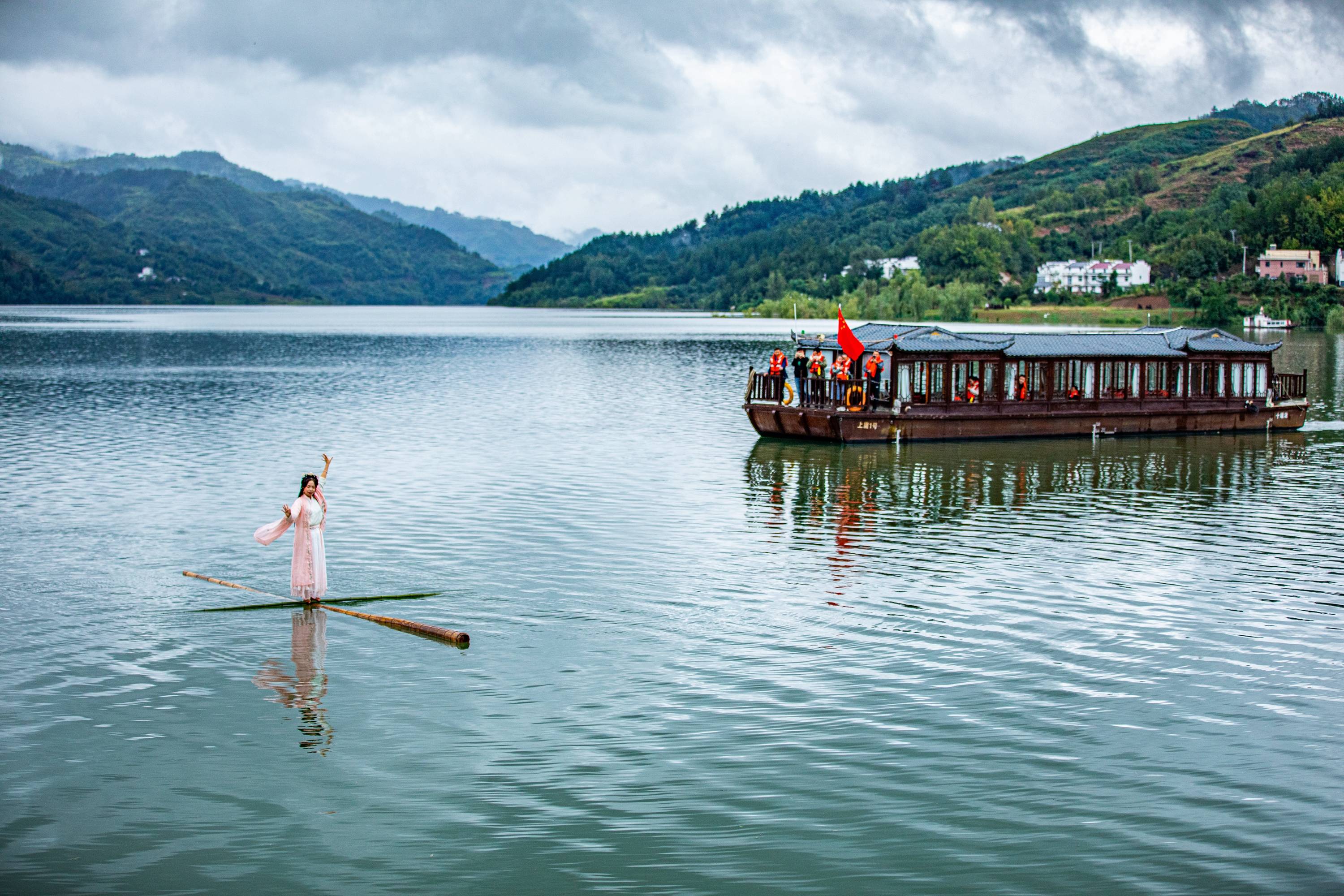 ↑2023年10月6日,湖北省十堰市竹山县上庸镇圣水湖,游客在观赏贵州省非物质文化遗产项目独竹漂表演。CICPHOTO/章磊 摄