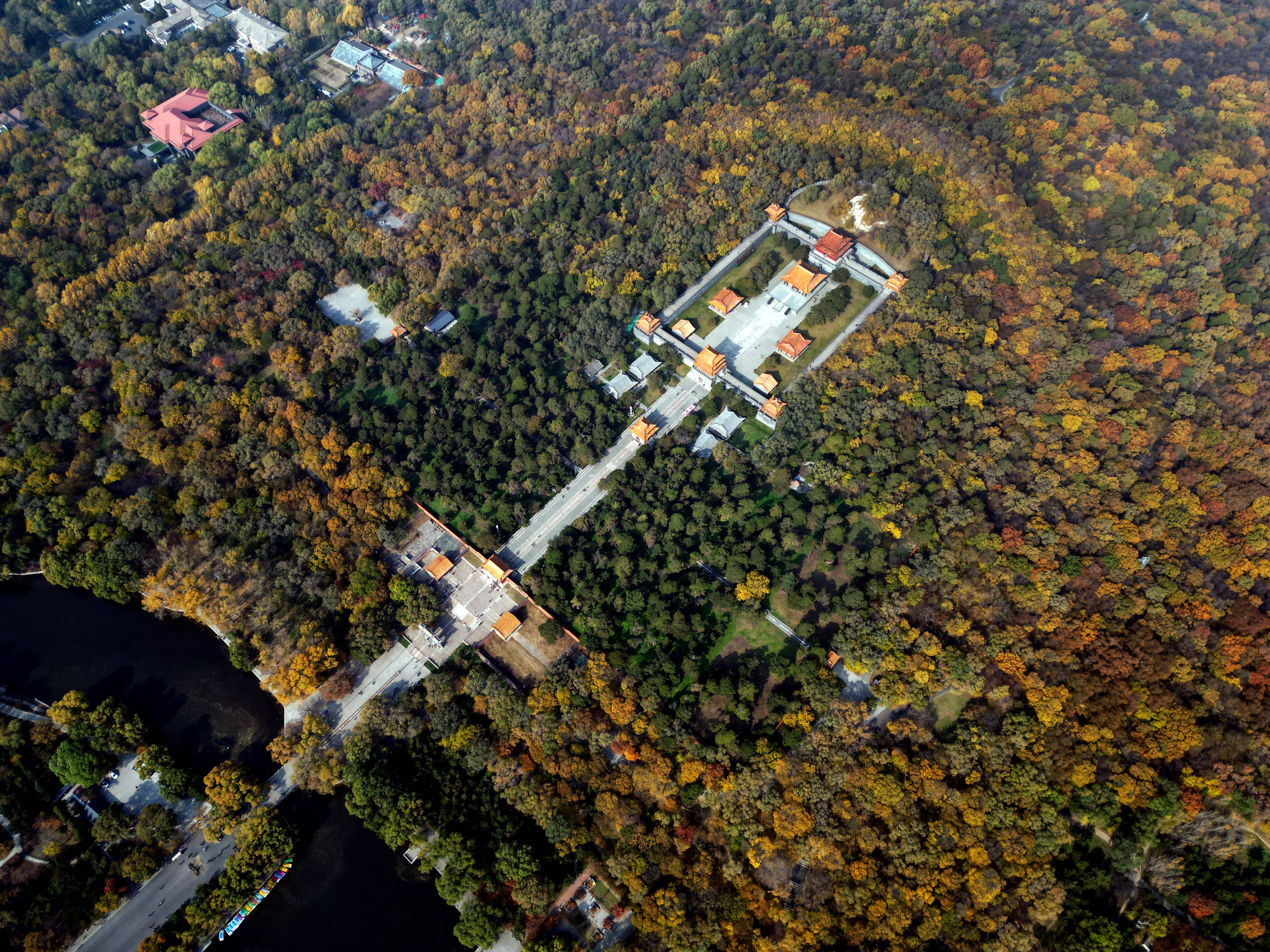 ↑2023年10月25日,辽宁省沈阳市世界文化遗产清昭陵层林尽染,秋景如画。(无人机照片)CICPHOTO/黄金崑 摄