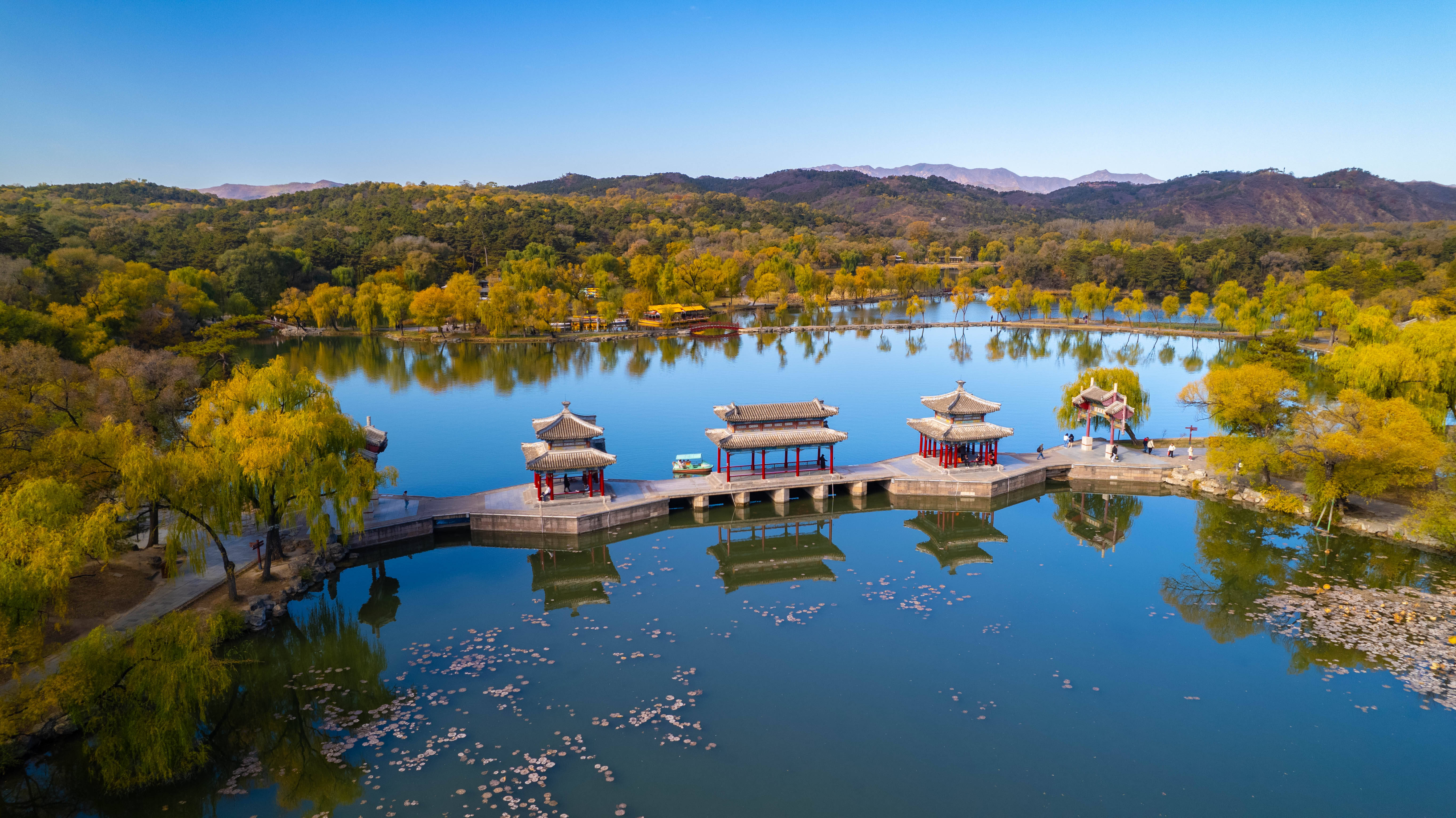 ↑2023年10月26日,在河北省承德市世界文化遗产、中国现存最大的古典皇家园林避暑山庄,树林色彩斑斓,将山庄装点得如诗如画。(无人机照片)CICPHOTO/孙占军 摄