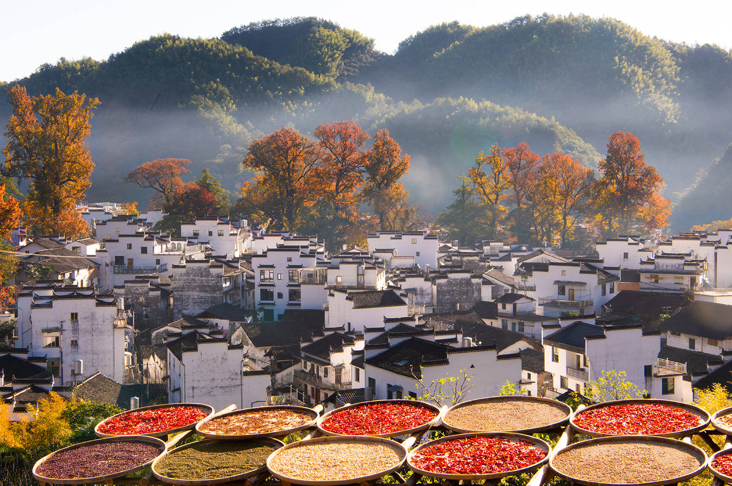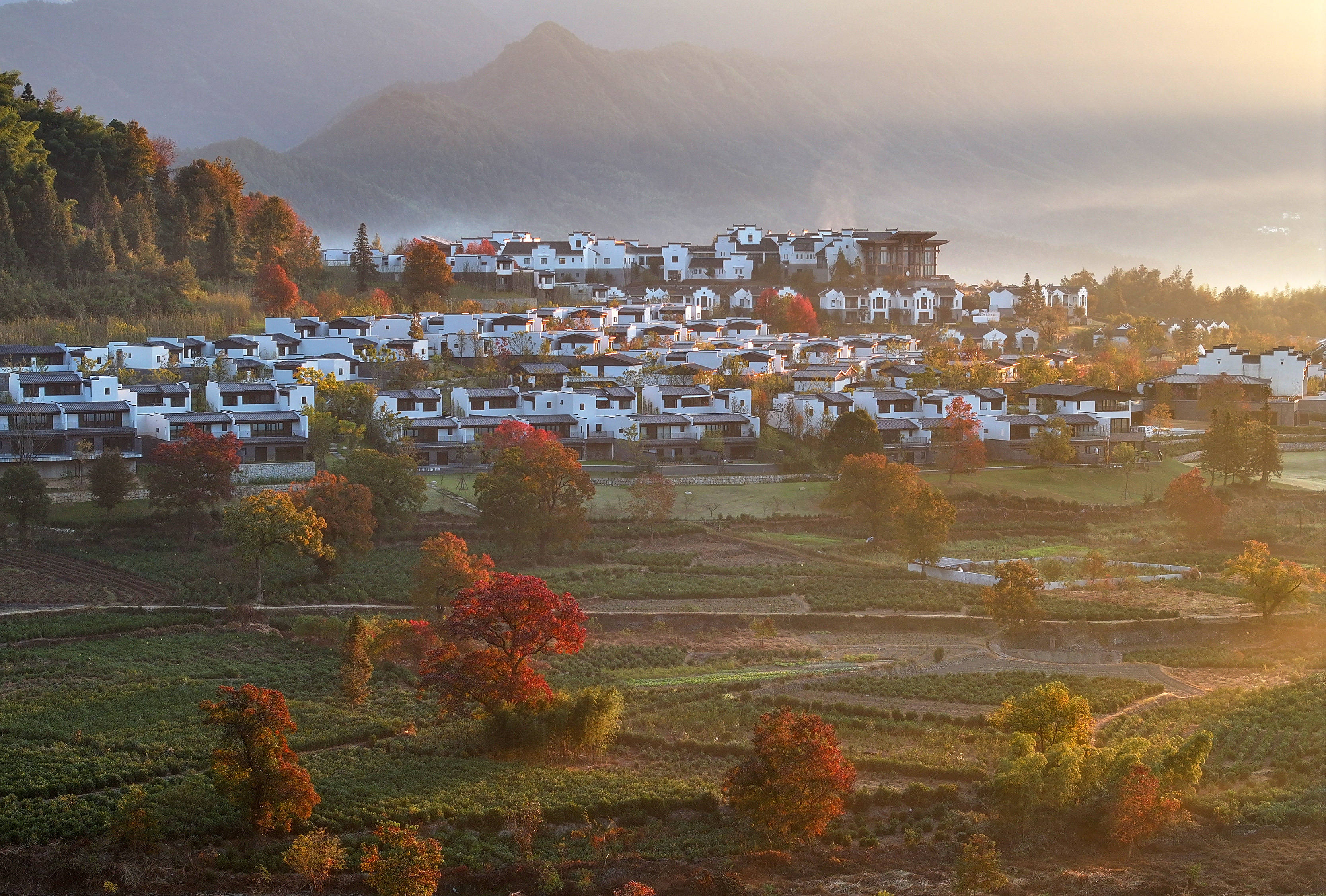 ↑2023年11月1日在安徽省黄山市黟县宏村镇卢村拍摄的旖旎秋景。(无人机照片)CICPHOTO/施亚磊 摄