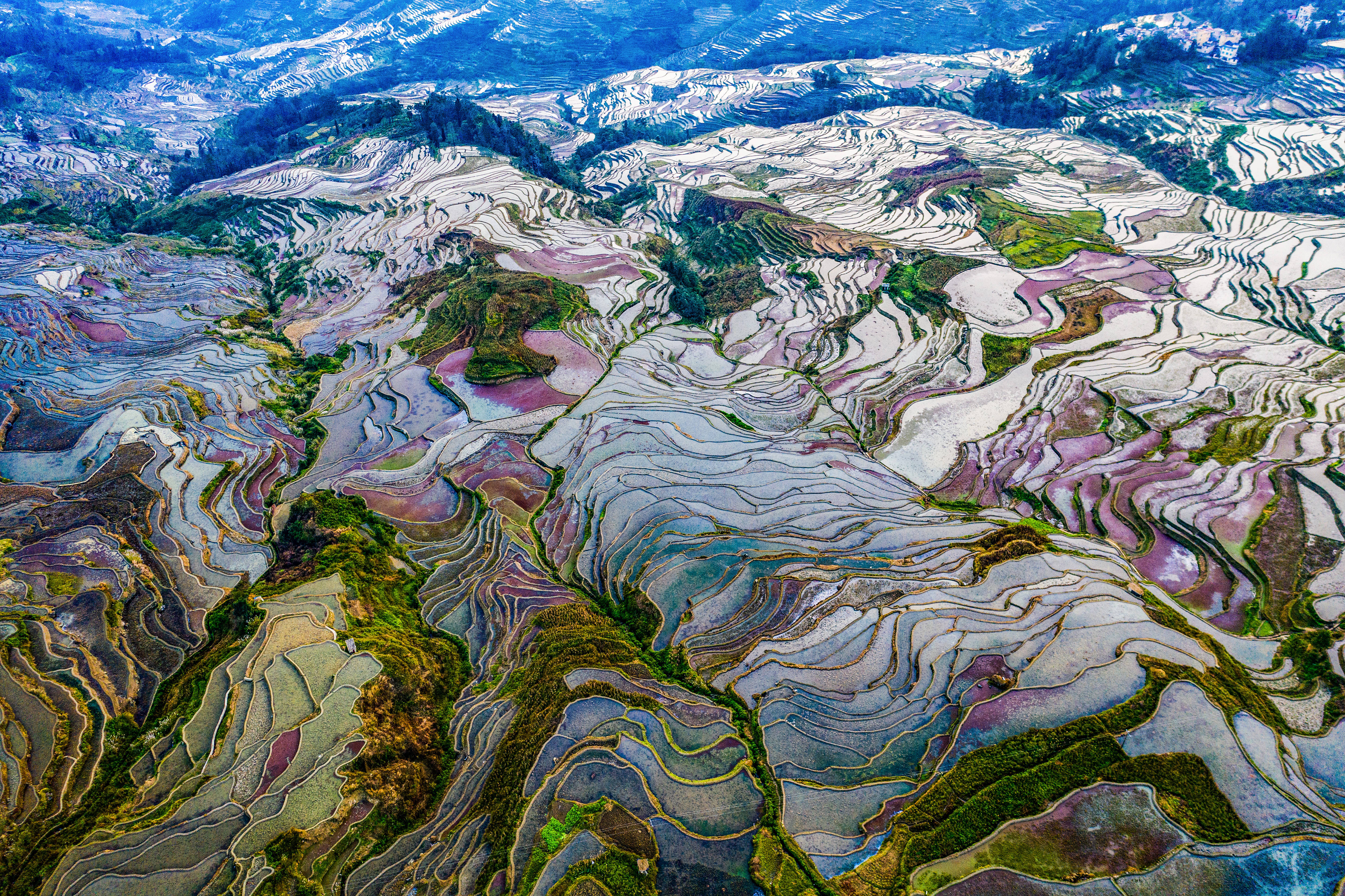 ↑2021年9月9日在云南省红河哈尼族彝族自治州元阳县拍摄的箐口梯田。哈尼梯田于2013年被列入世界文化遗产名录。(无人机照片)CICPHOTO/甘与汇 摄