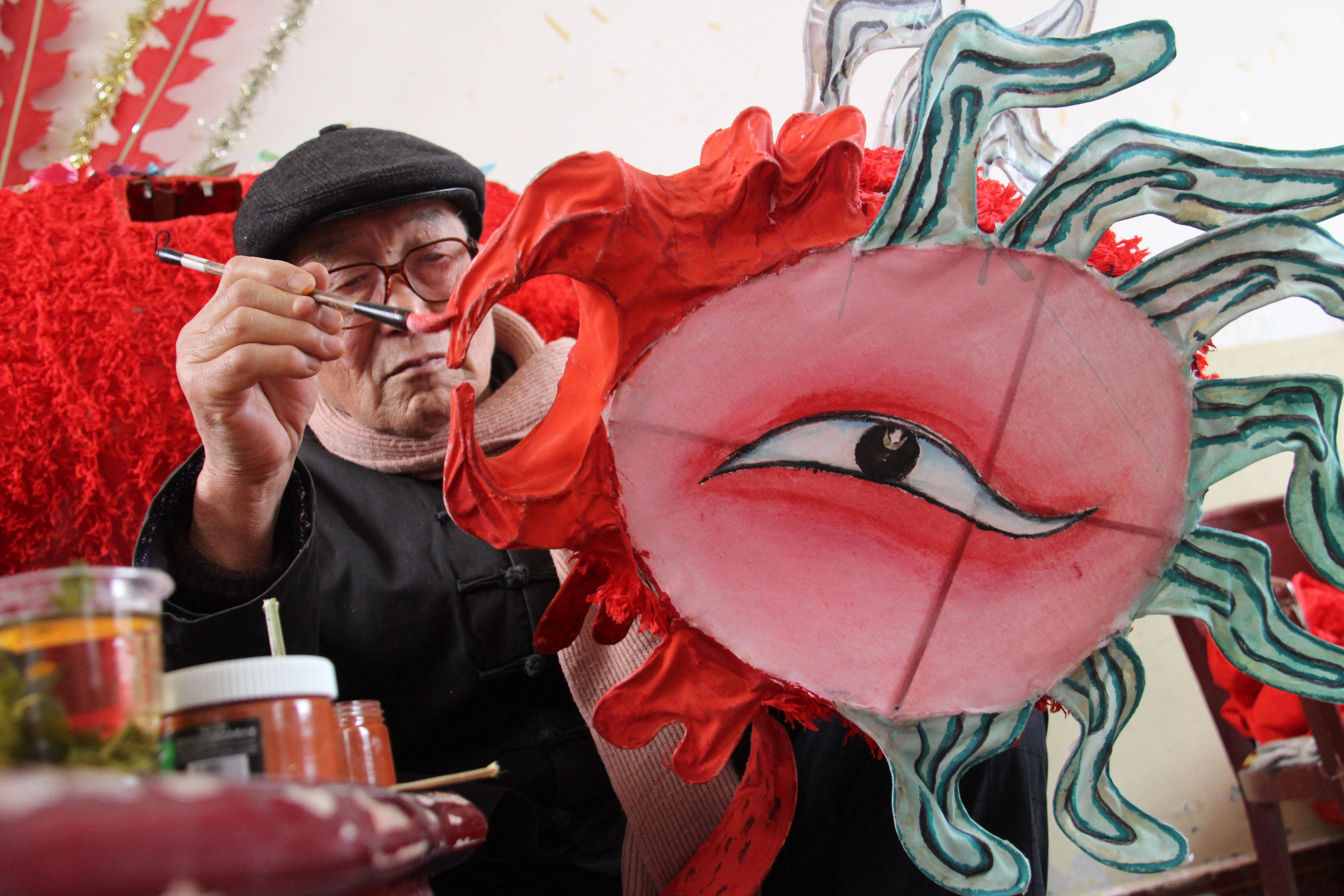 ↑2014年12月11日,在湖北省十堰市郧阳区文化馆,民间艺人在描绘郧阳凤凰灯头饰。CICPHOTO/曹忠宏 摄