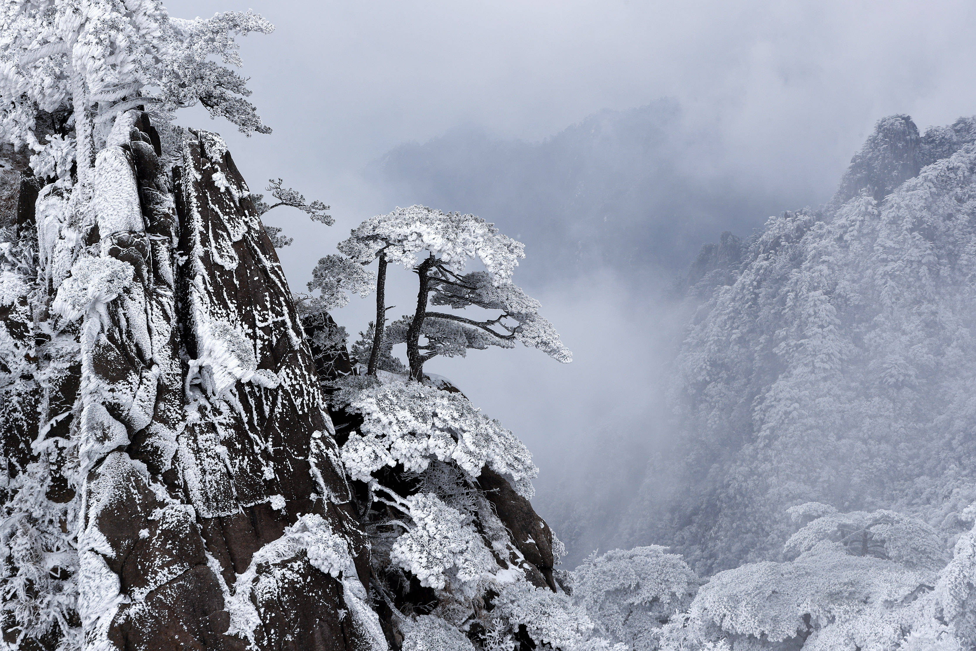 ↑2023年12月16日,在安徽省黄山市,“双遗产”名山黄山银装素裹、宛如仙境。CICPHOTO/施亚磊 摄