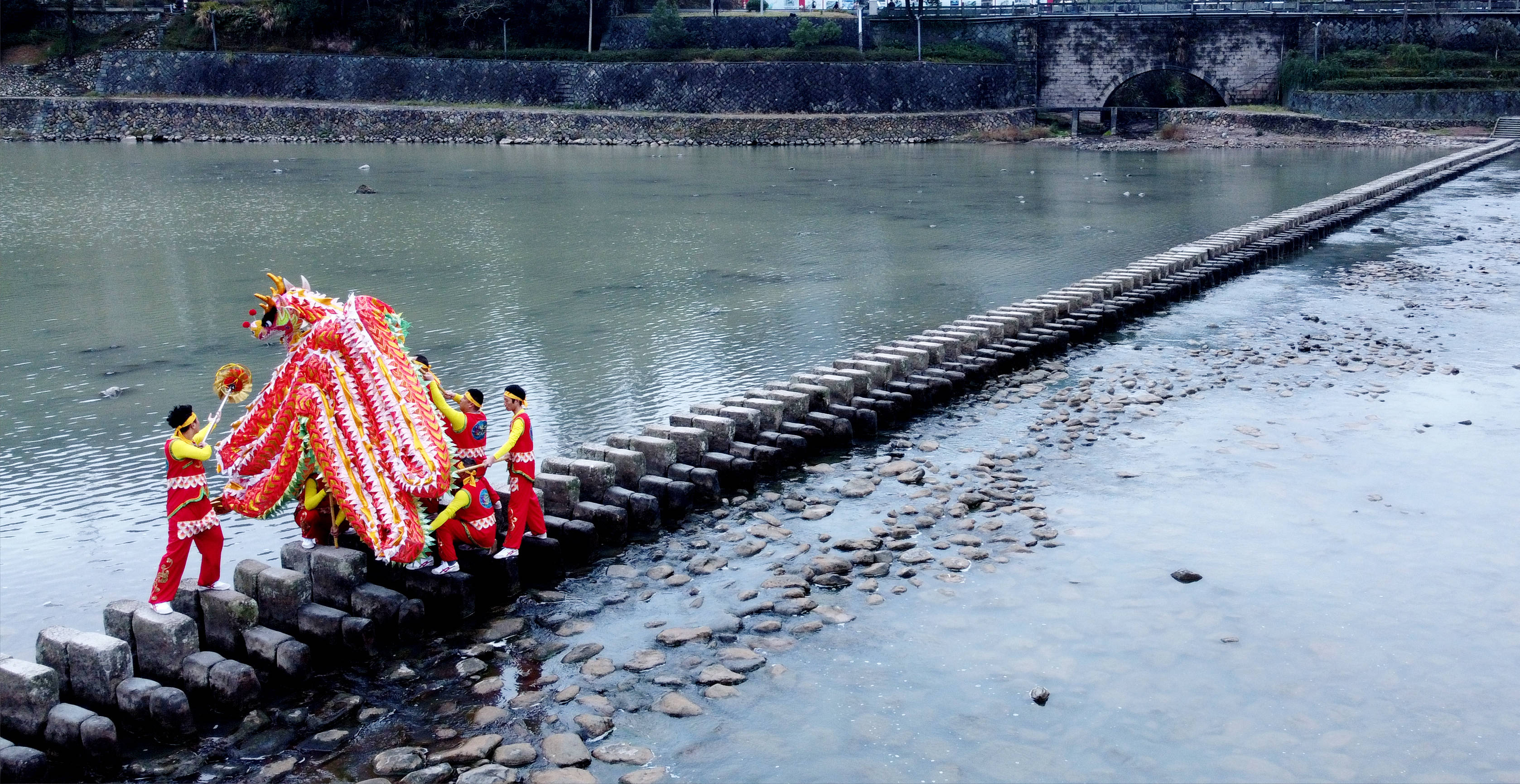 ↑2022年1月19日在浙江省温州市泰顺县仕阳镇仕水碇步拍摄的国家级非物质文化遗产项目碇步龙。CICPHOTO/周汉祥 摄