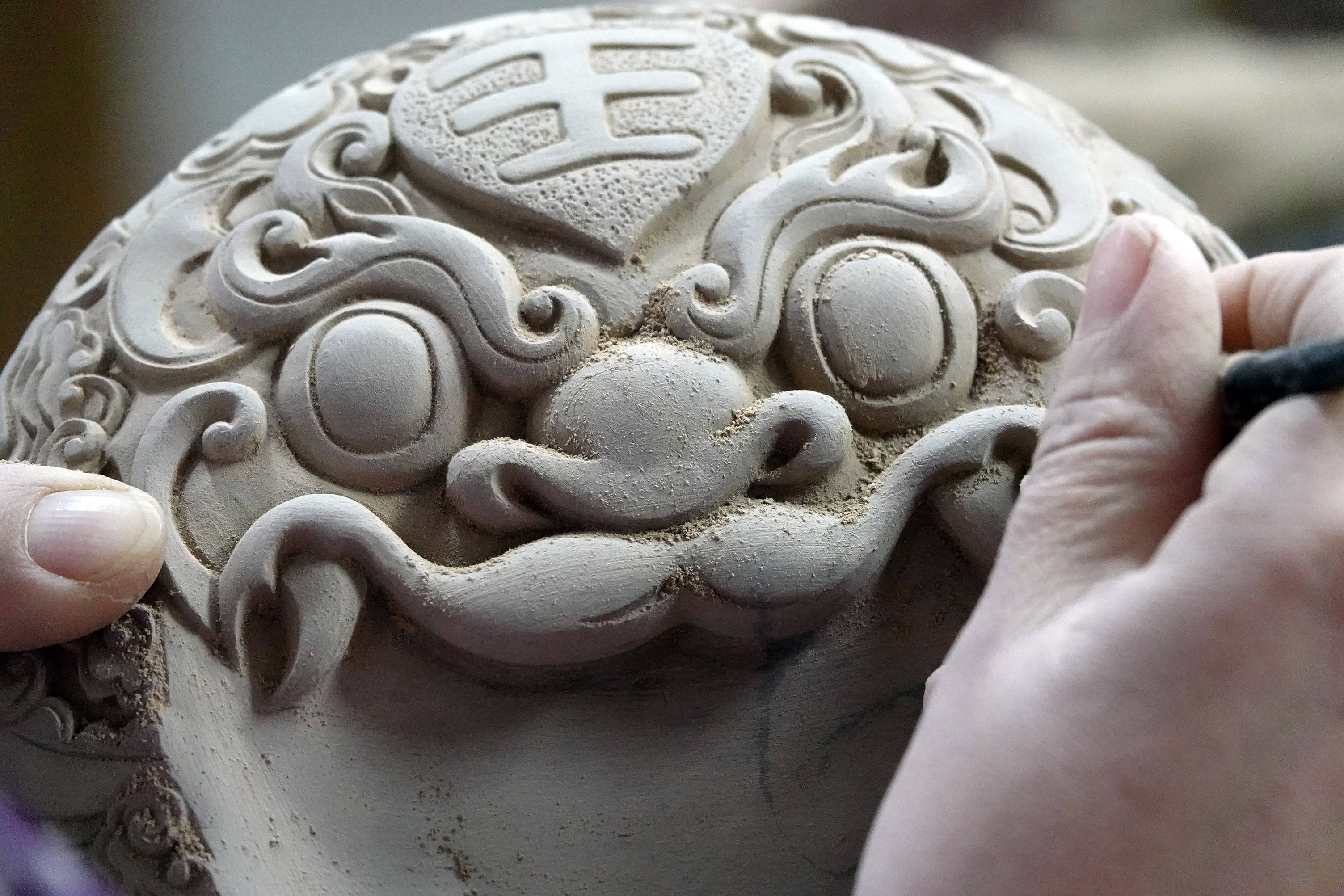 ↑2022年1月7日,在山西省运城市新绛县,国家级非物质文化遗产绛州澄泥砚制作技艺省级传承人蔺涛在雕修“虎虎生威”生肖虎绛州澄泥砚。CICPHOTO/高新生 摄