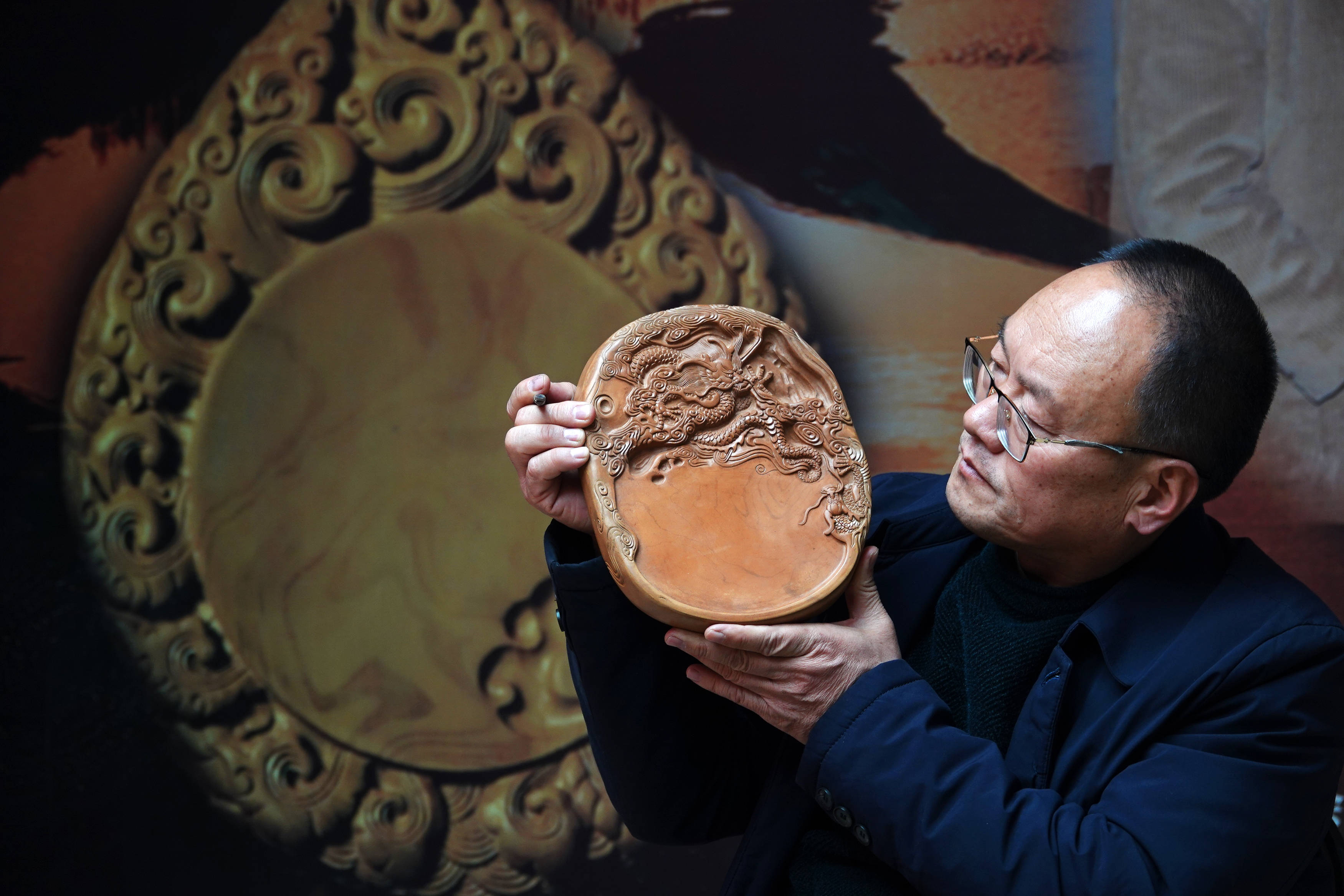 ↑2024年1月19日,在山西省运城市新绛县,国家级非物质文化遗产绛州澄泥砚制作技艺省级传承人蔺涛在查看龙年系列绛州澄泥砚品相。CICPHOTO/高新生 摄