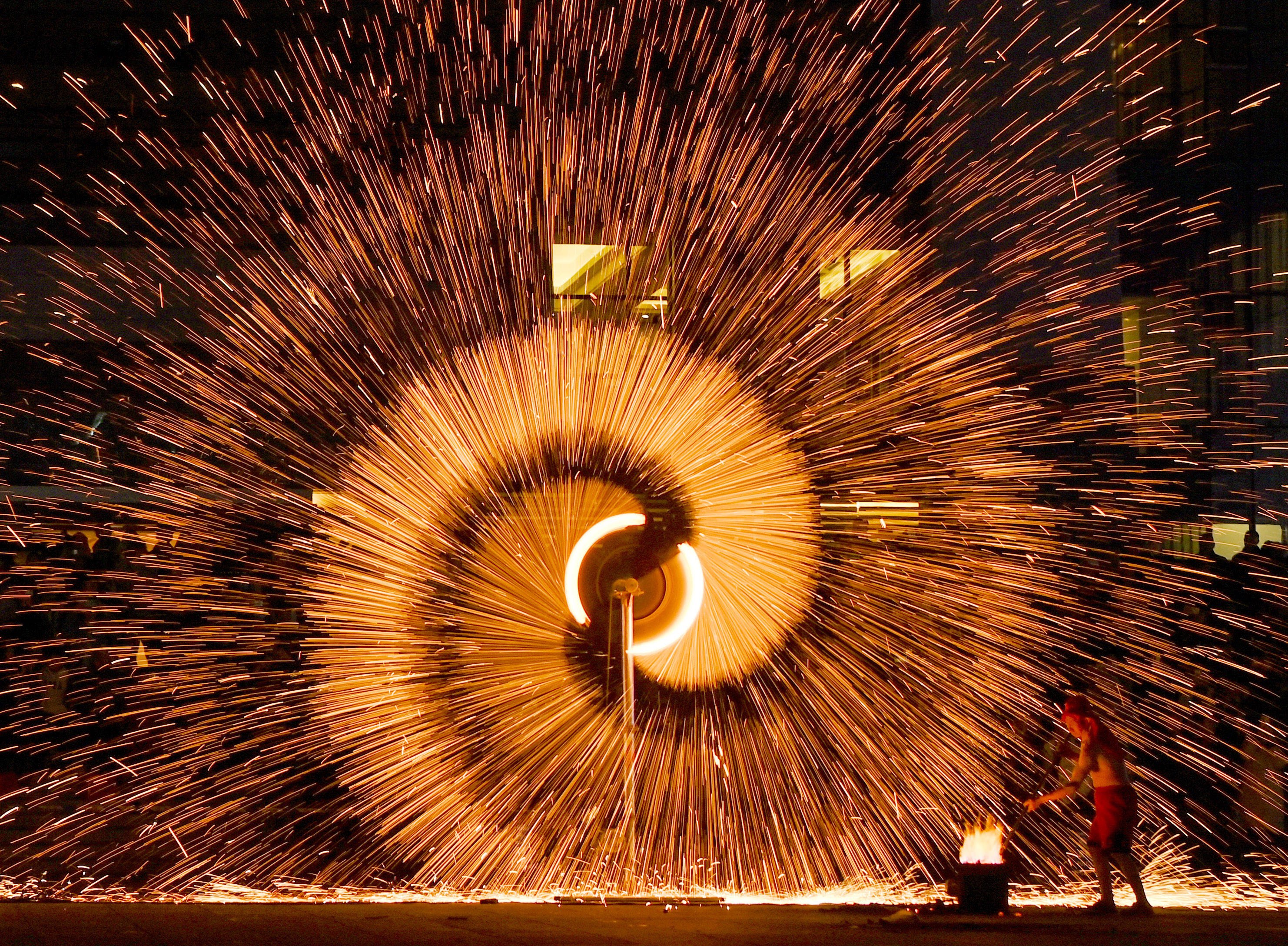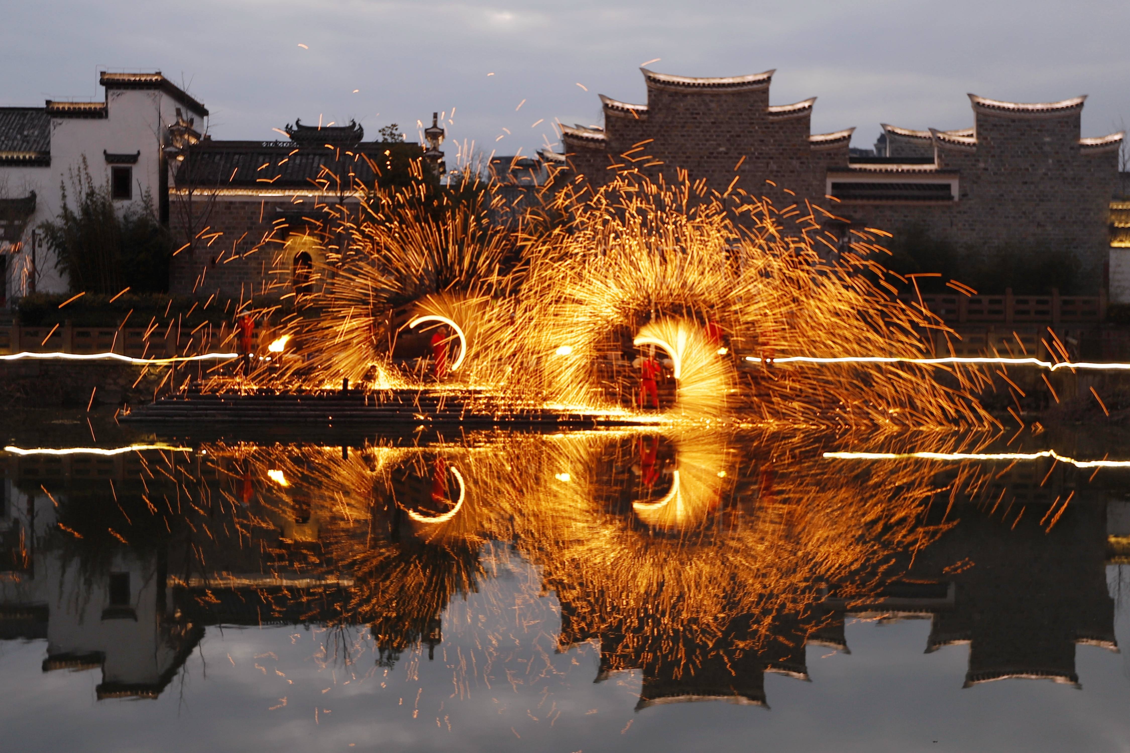 ↑2024年2月17日,在安徽省芜湖市,民间艺人在鸠兹古镇表演传统项目打铁花。CICPHOTO/陈效宝 摄