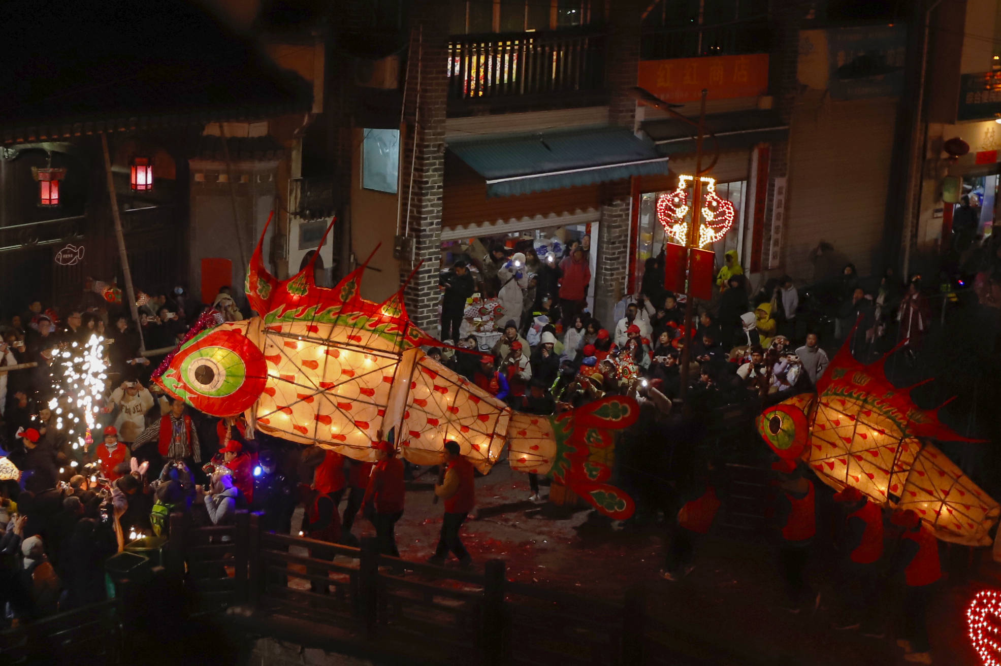 ↑2024年2月22日,在安徽省黄山市歙县溪头镇汪满田村,村民在表演汪满田鱼灯,引来游客和市民前来观赏。CICPHOTO/潘祯祥 摄