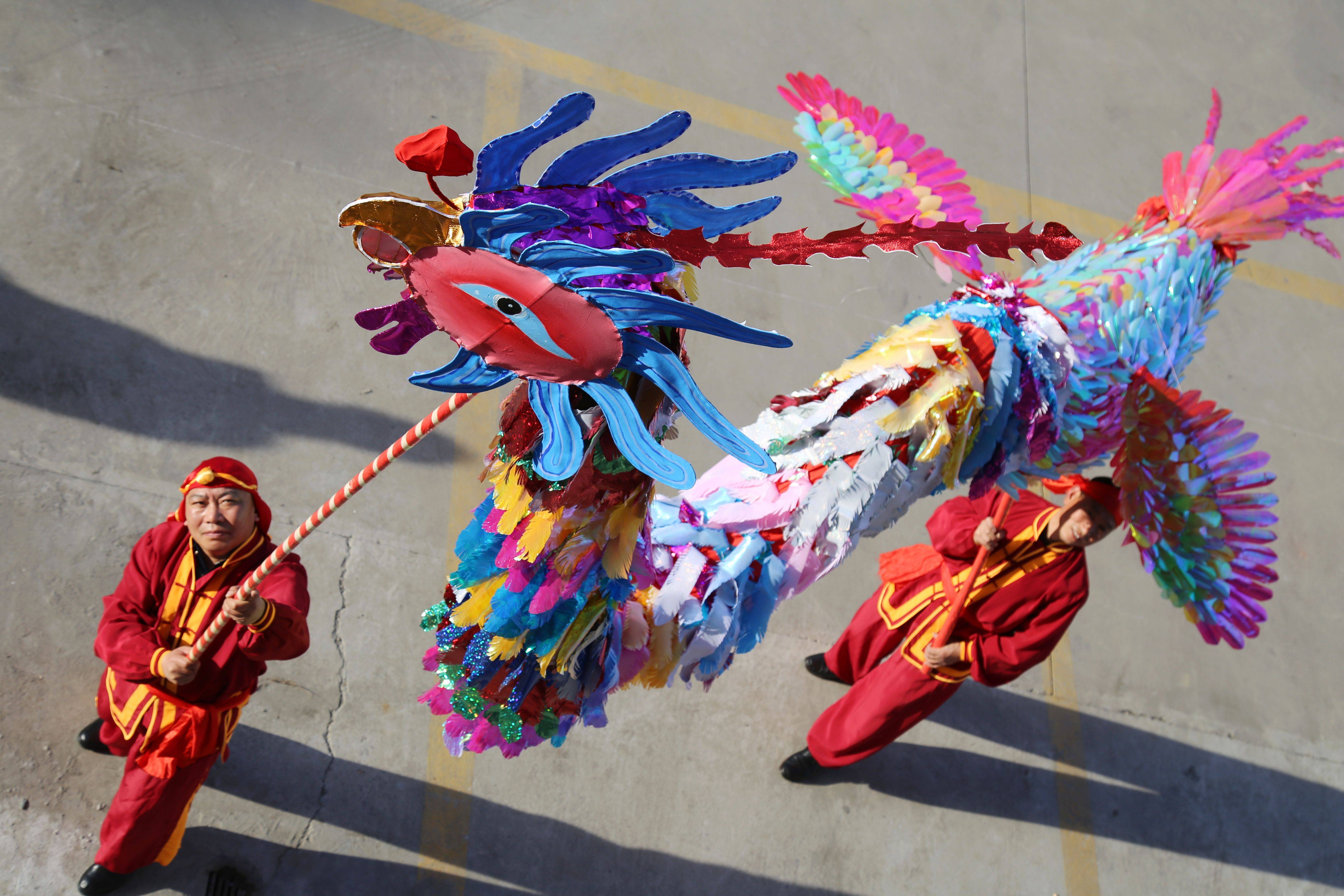 ↑2018年2月22日,在湖北省十堰市郧阳区文化馆,民间艺人在排练“郧阳凤凰灯舞”之凤凰回巢。CICPHOTO/曹忠宏 摄
