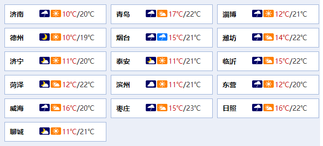 最低气温:潍坊、临沂、日照和半岛地区14℃左右,其他地区10℃左右。