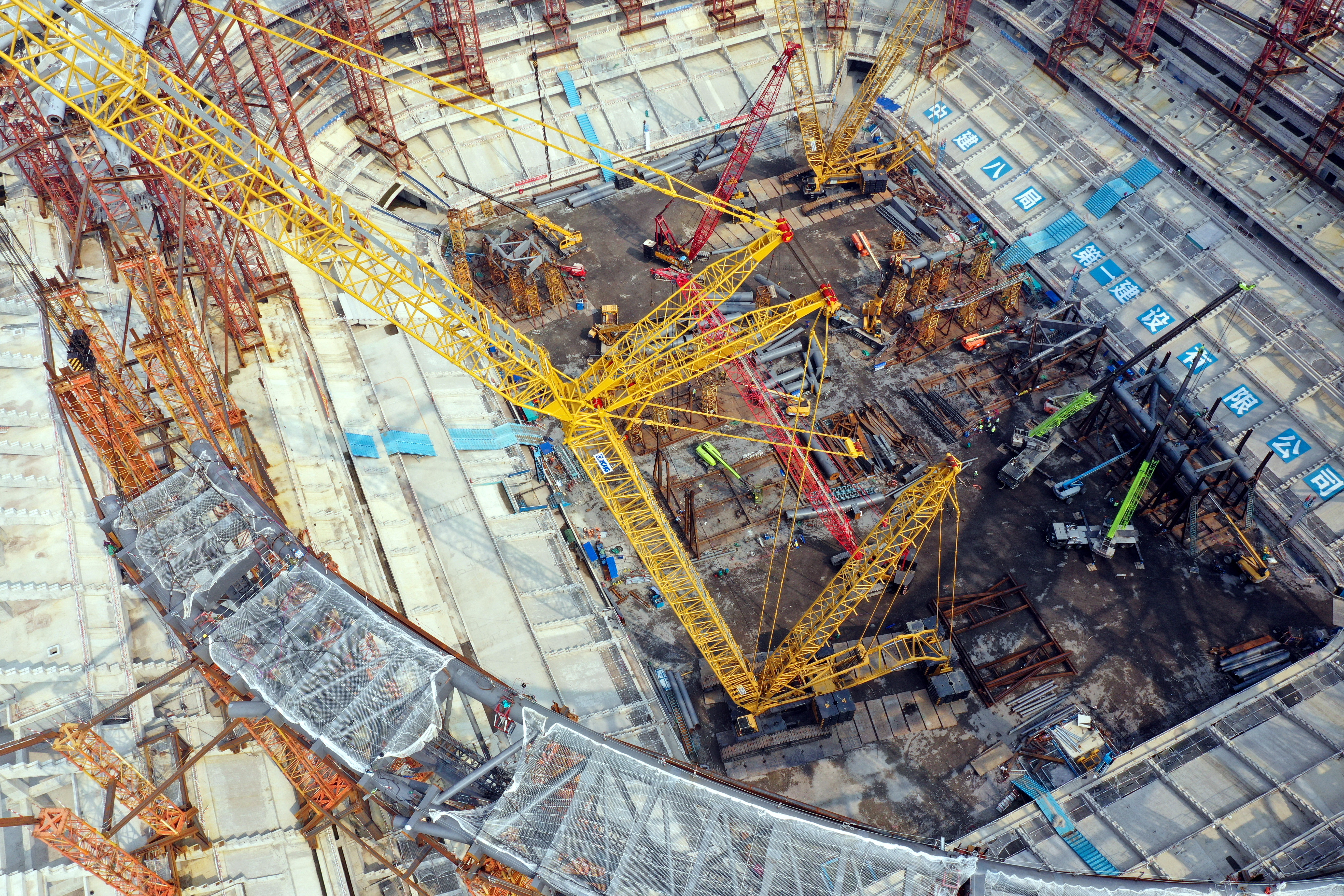 国庆假日,济南起步区凤凰黄河大桥西端,济南黄河体育中心足球场正加盖顶棚,大批机械和工人们在忙碌。
