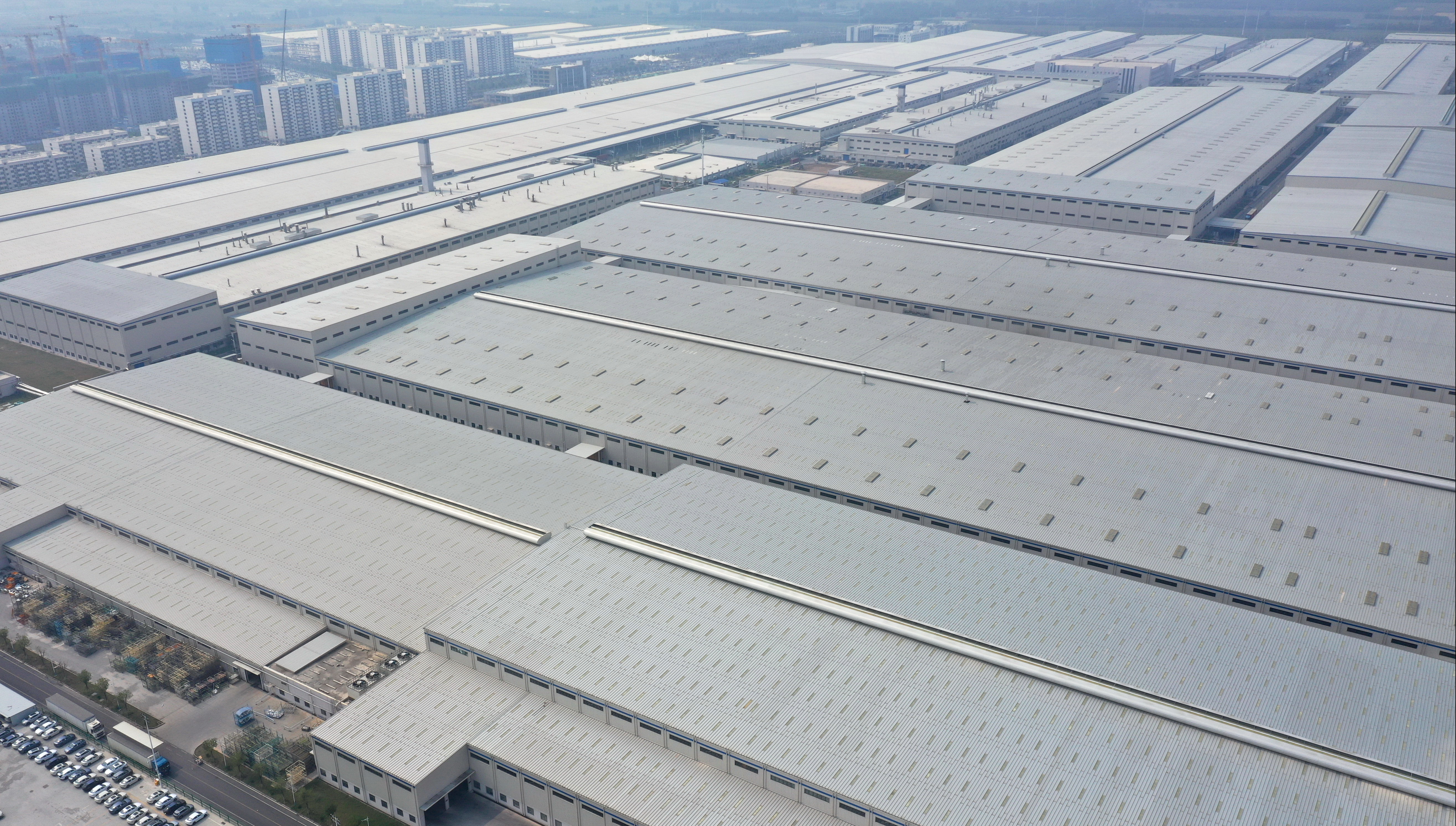 国庆假日,航拍济南起步区崔寨北侧的比亚迪汽车工业园全景。占地近6000亩的巨大工业园区气势雄伟,银灰色厂房连成一大片。