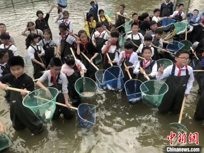 学生们在桑基鱼塘里,体验捕鱼乐趣。和孚镇供图