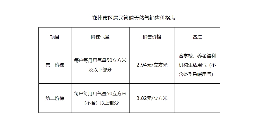 郑州市区居民天然气价格调整,第一阶梯2.94元