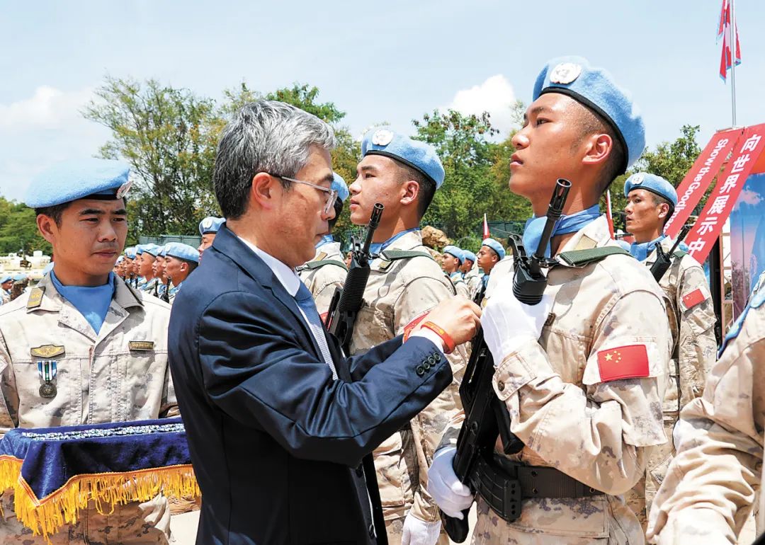 授勋仪式上,联南苏团部队司令莫汉宣读并颁发嘉奖令,中国驻南苏丹大使马强等嘉宾为步兵营官兵代表佩戴勋章。联南苏团团长海索姆检阅我维和步兵营受阅方队。我维和官兵迈着整齐有力的步伐走过主席台前,现场嘉宾纷纷起立,向维和官兵们致敬。海索姆表示:“中国维和步兵营始终致力于履行联南苏团赋予的各项任务,为南苏丹人民带来希望与和平。”
