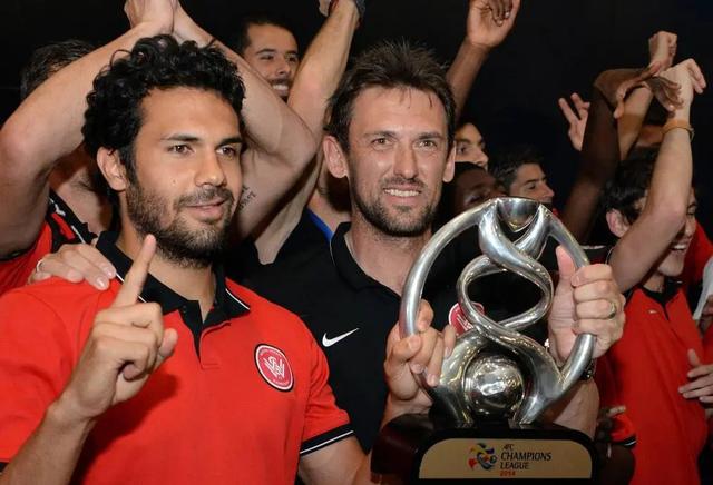 2014年11月3日,时任西悉尼流浪者队主教练托尼·波波维奇(前右)与队长尼古拉·托波尔-斯坦利手举亚冠奖杯庆祝。新华社发/法新