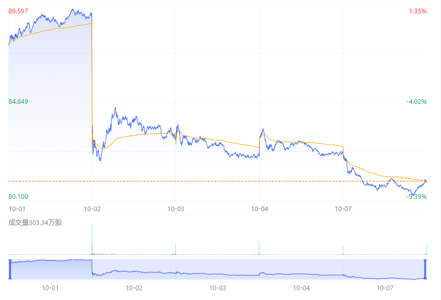 从消息面看,耐克股价因受财报影响而出现大幅下跌,营收与净利润的下降影响了投资者对其未来发展的信心。截至10月9日上午9时,耐克股价整体依旧延续下跌态势,报80.770美元/股,成交额为8.51亿美元。